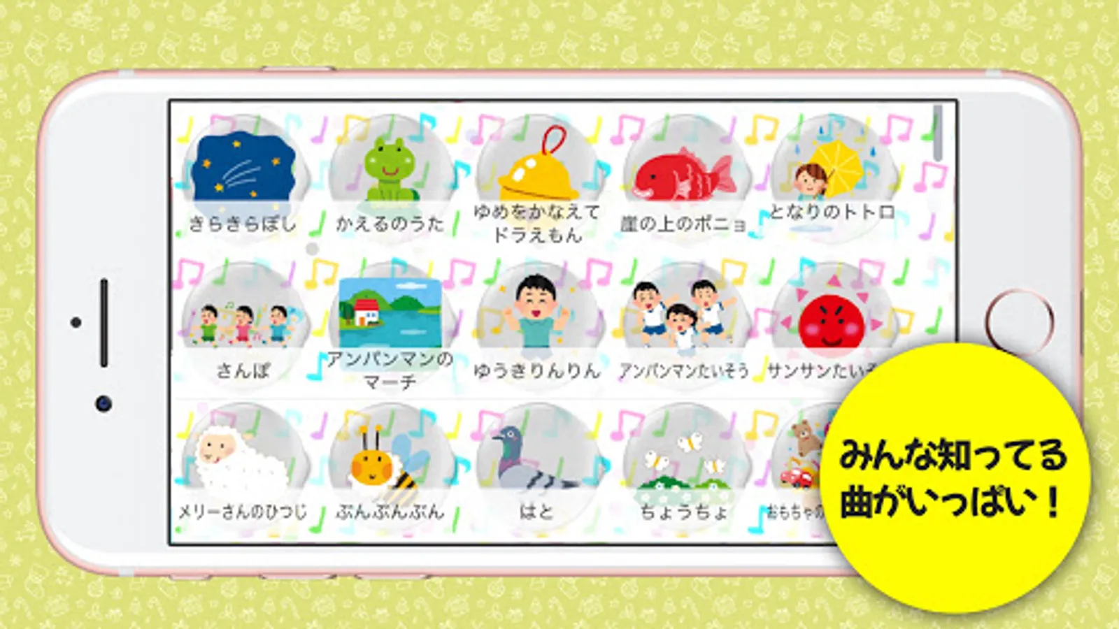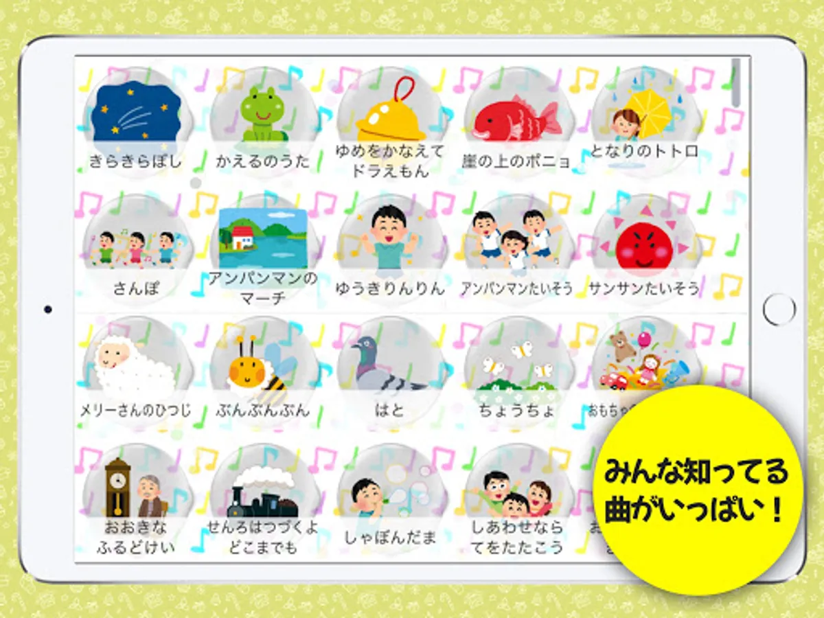 Anpanman, Doraemon, nursery rhymes, and other children's favorite songs can be enjoyed just by tapping along with the melody.