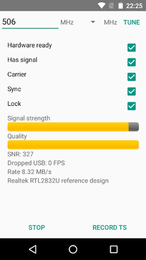 For developers and advanced users, the driver provides a diagnostic mode that allows dumping DVB-T and DVB-T2 transport stream into a TS file. Files are stored on the external storage in the private directory of the app. Files need to be deleted manually.