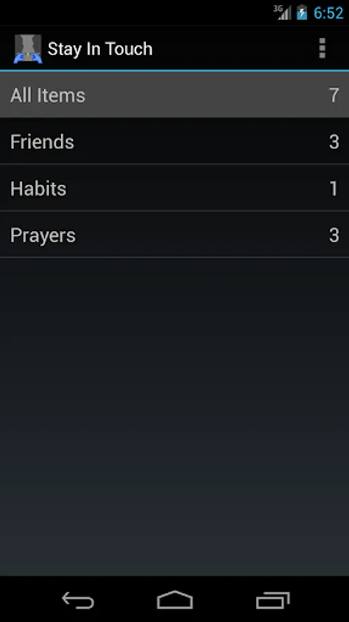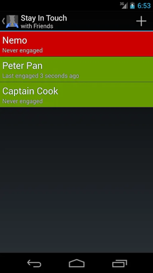"Stay In Touch" allows you to store multiple lists of people/items/events/etc with which you wish to interact regularly; but for which you do not want to impose a very definite schedule. For each item you add to the list, you can indicate a nominal time period/frequency with which you want to interact with that item. Items are then dynamically sorted by urgency; helping you to stay in touch with the people and things that mean a lot to you; rather than allowing them to become buried in your busyness.