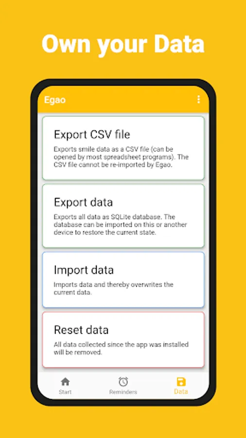 We consider smiling as a minimal intervention for your well-being and mental health. Consequently, we consider all collected data as personal and help you to keep it private. All smile data is stored only locally, and there is no data transfer to any server (we don't even have one).