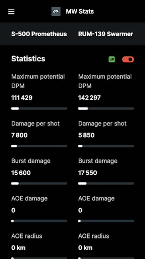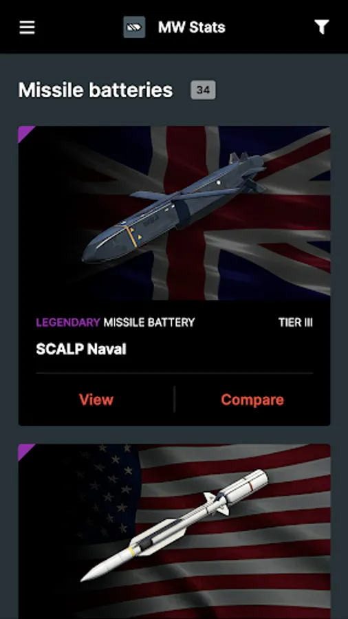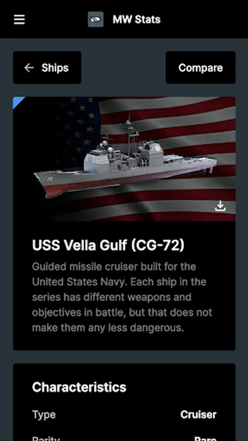 This app provides statistics and numbers for ships and items in the Modern Warships mobile game. You can view and compare the following: