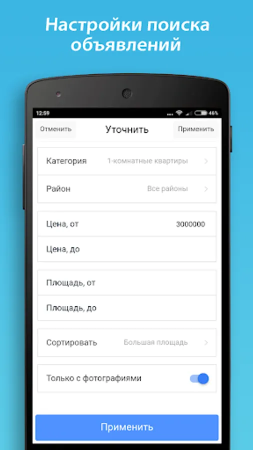The application allows you to customize the search by property type, area, cost, area, distance from your current location and other parameters.