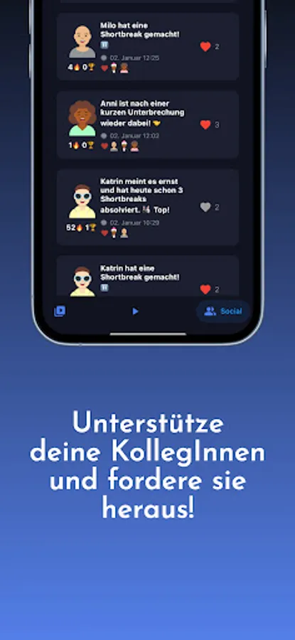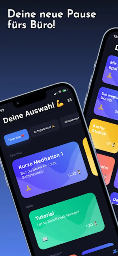 Almost two thirds of adults suffer from recurring back pain. Shortbreak helps avoid this pain by allowing users to regularly take short breaks from movement during work hours. The app is designed to take short physical breaks directly at the workplace and during working hours and also improves the often poor ergonomics in office and home office environments.
