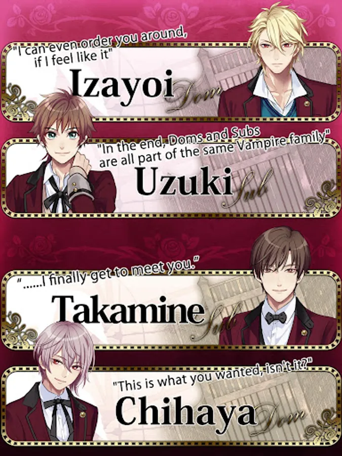 "Blood Domination" is a visual-novel BL game. Players get to enjoy the scenarios through the usage of Scenario Ticket.