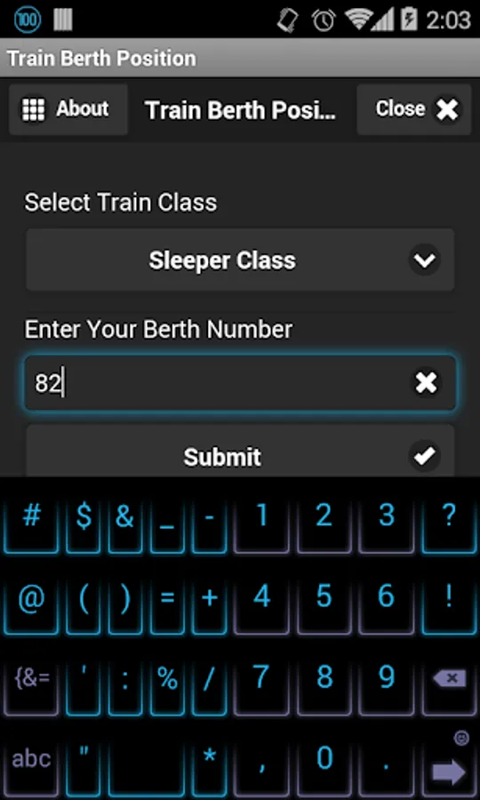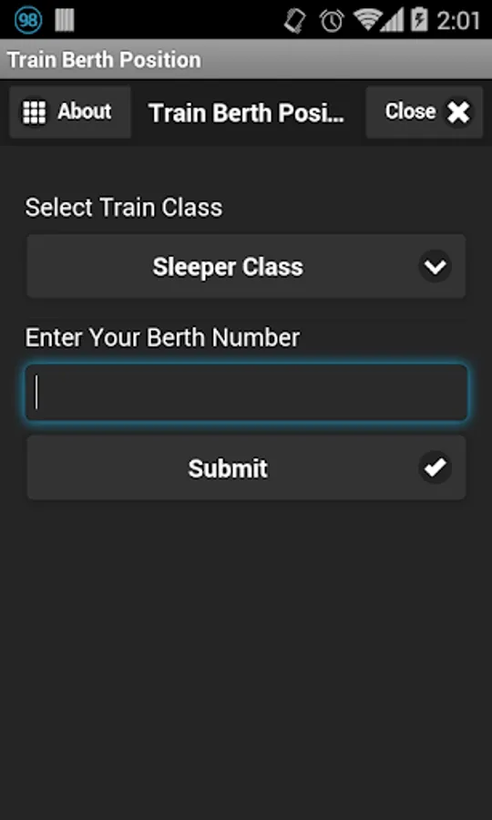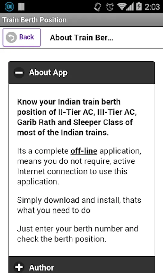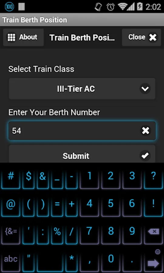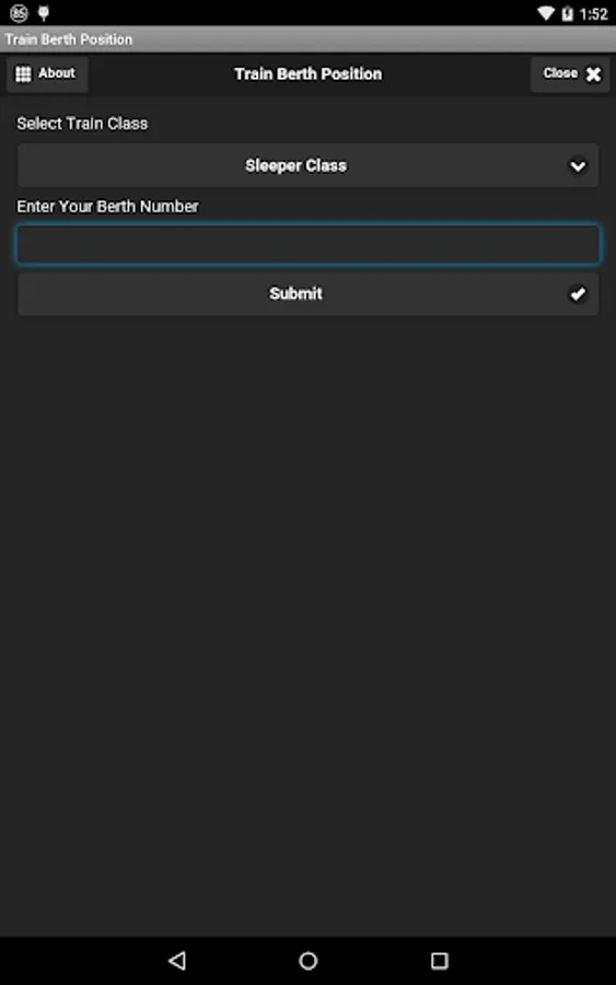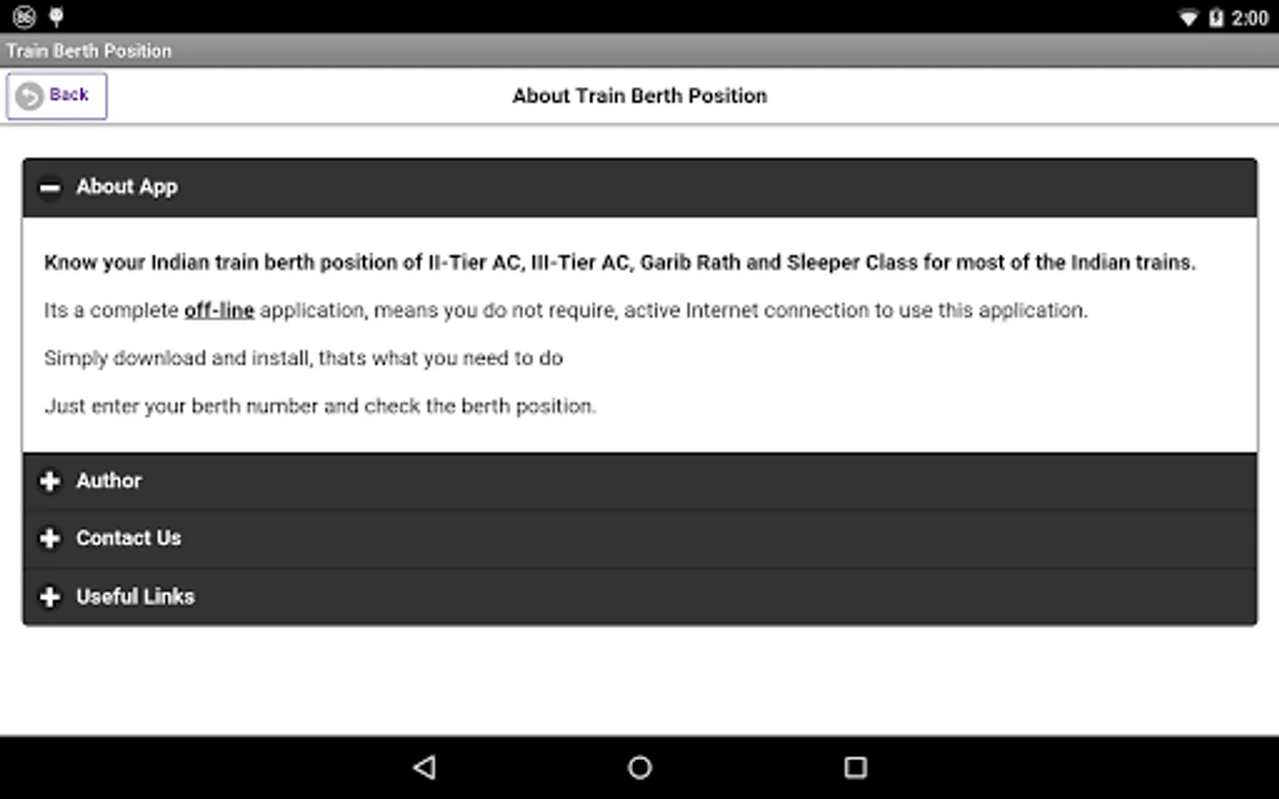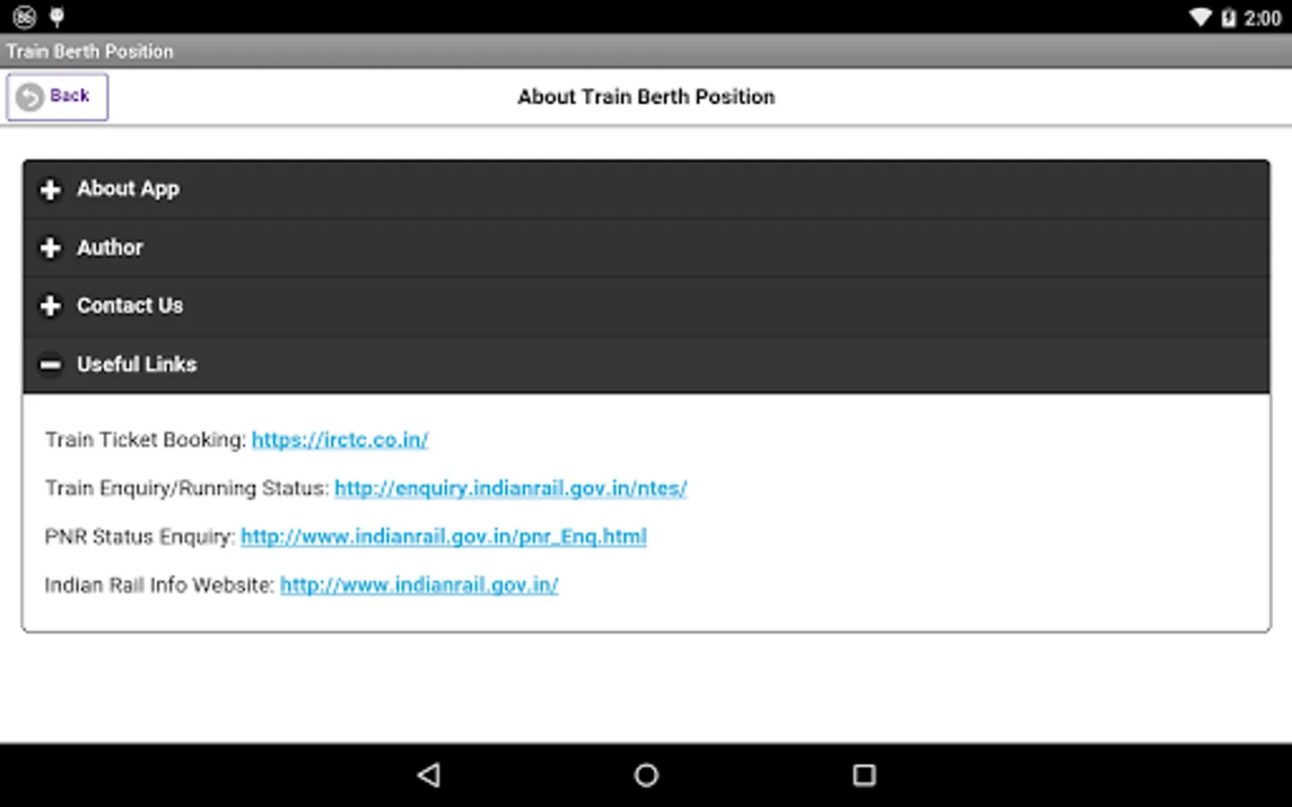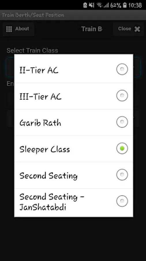 With this application, you can view II-Tier AC, III-Tier AC, Garib Rath, Sleeper Class, Second Seating, JanShatabdi berth/seat position of most of the Indian trains.