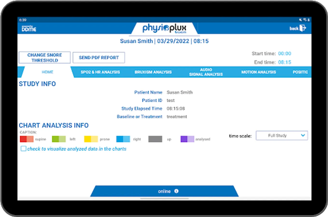 Physioplux for Bruxism Professional app further manages and analyzes the four channels of information recoded by the Physioplux for Bruxism app. This app provides archival cloud storage of data by user name and retrieval of that data for future review. The number of night time clenches and grinds analyzed from the EMG data is calculated as part of a detailed report. This app is an optional addition to the Physioplux for Bruxism app.