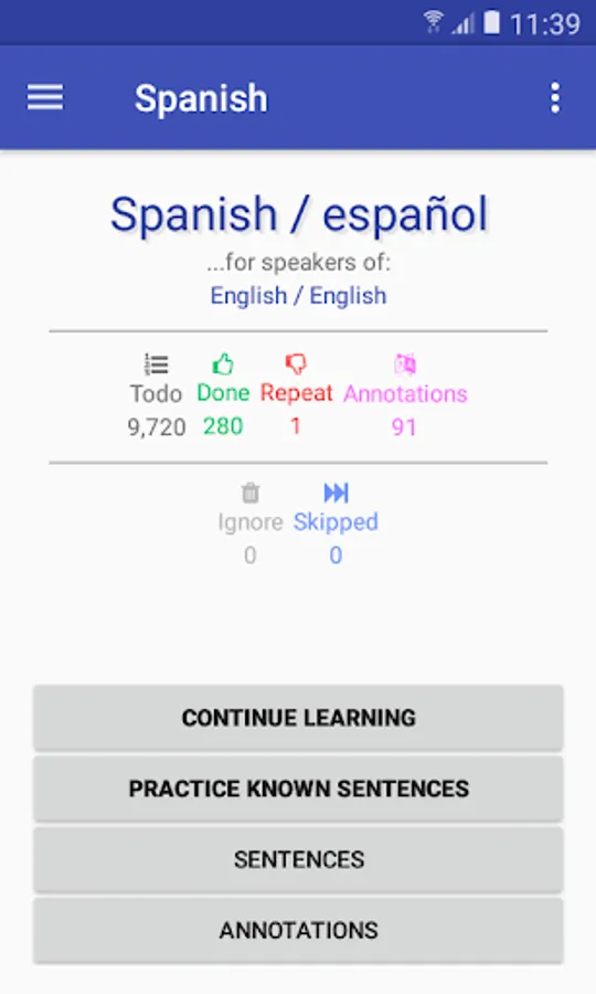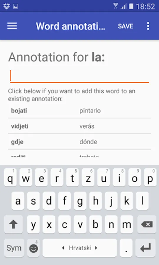 As you progress with new sentences, you can create "annotations" on words you don't know. Annotations can be anything, but the best usage is to use them to create your own dictionary. More than one word can have the same annotation (so, for example, one verb in different tenses will have one translation/annotation).