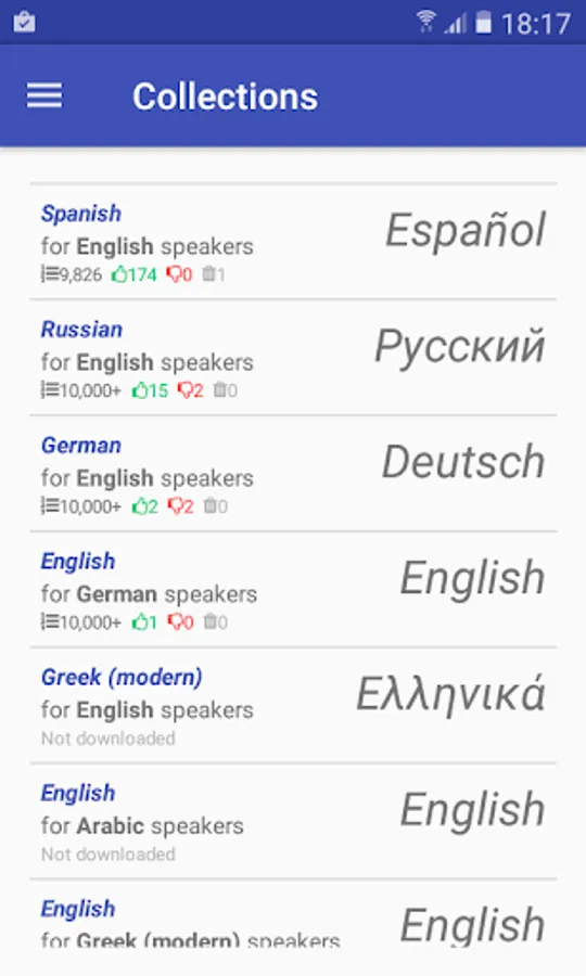 The application currently has 24 languages (see below for the list). Each language is available in two "directions". For example "French for English speakers" and "English for French speakers". More languages will be added in future.