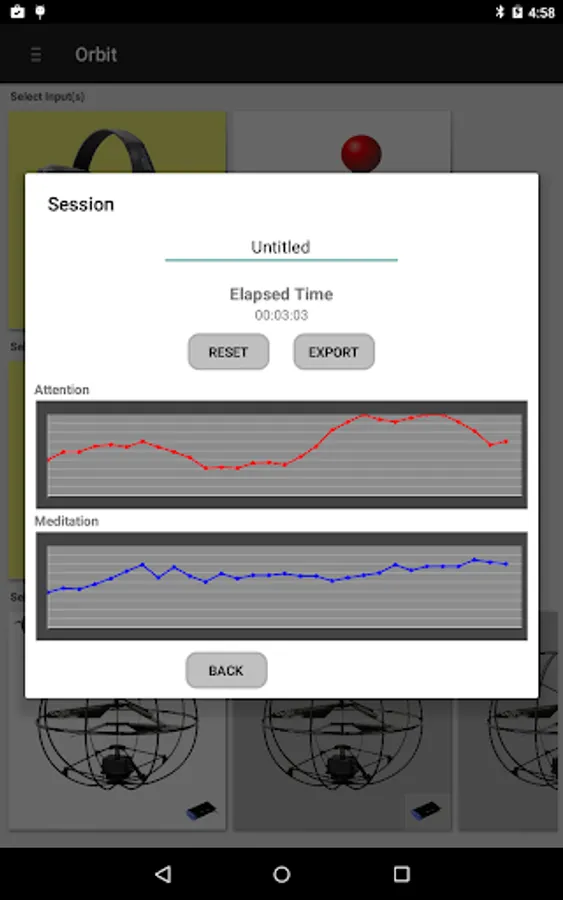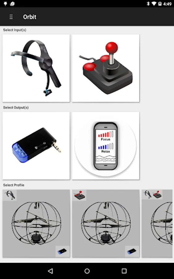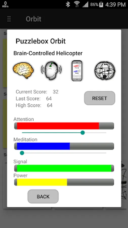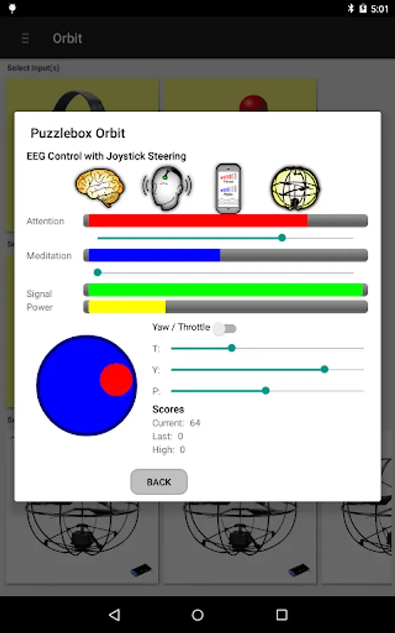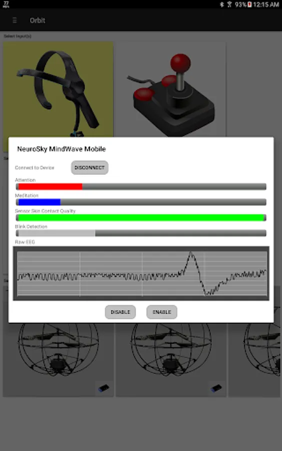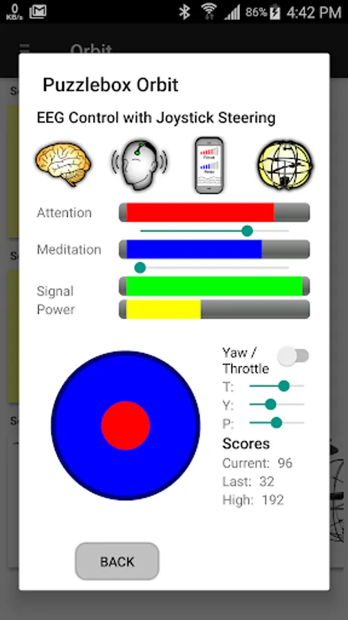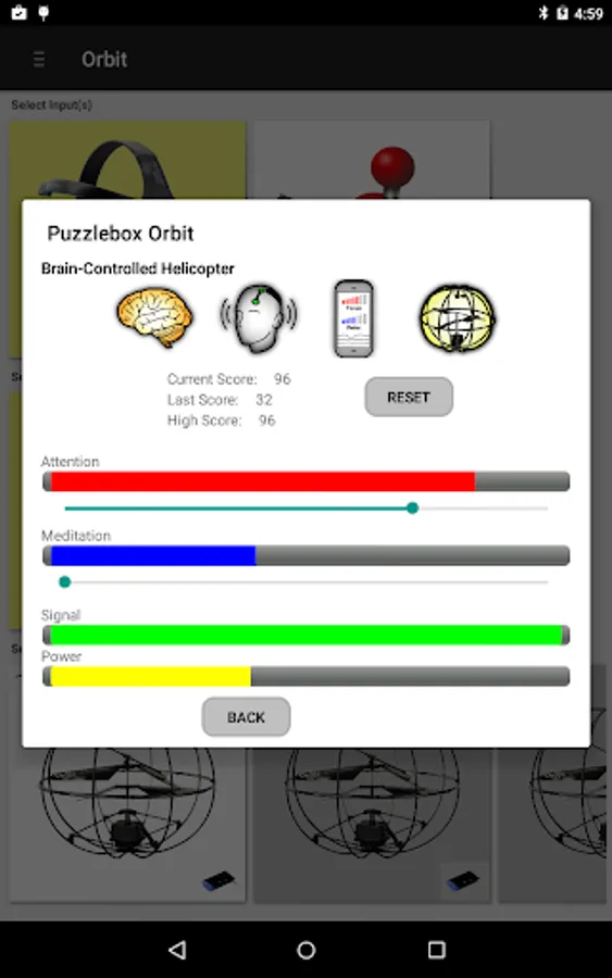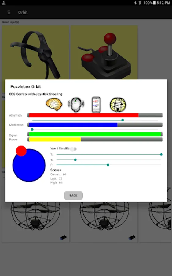 This application connects to a NeuroSky MindWave or Emotiv Insight EEG headset to read your brainwaves. For NeuroSky devices, target levels of focused concentration ("Attention") and/or mental relaxation ("Meditation") are set using sliders. For Emotiv devices "Mental Commands" can be trained to match your specific brainwaves. When you reach your target the Puzzlebox Orbit helicopter will take off. It will continue flying for as long as you maintain your goal. A touchscreen joystick can be used to steer. And session data is now collected, graphed, and can be shared to cloud storage, messaging services, and via email.