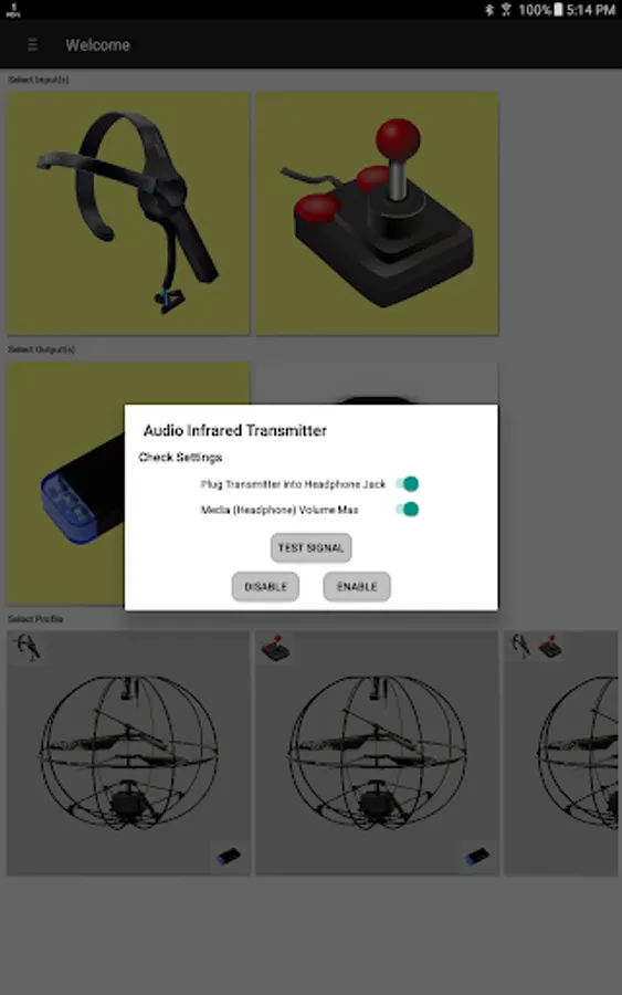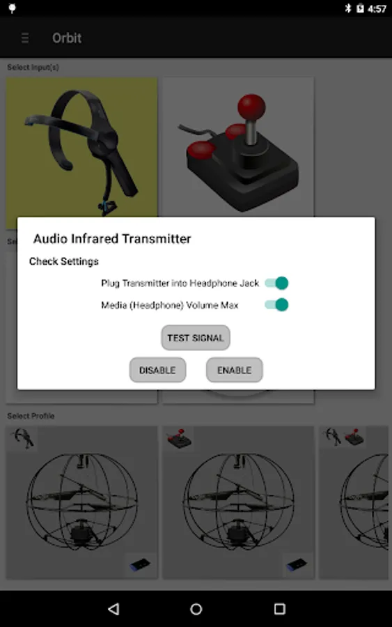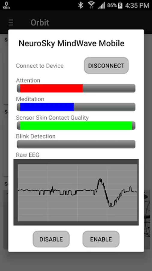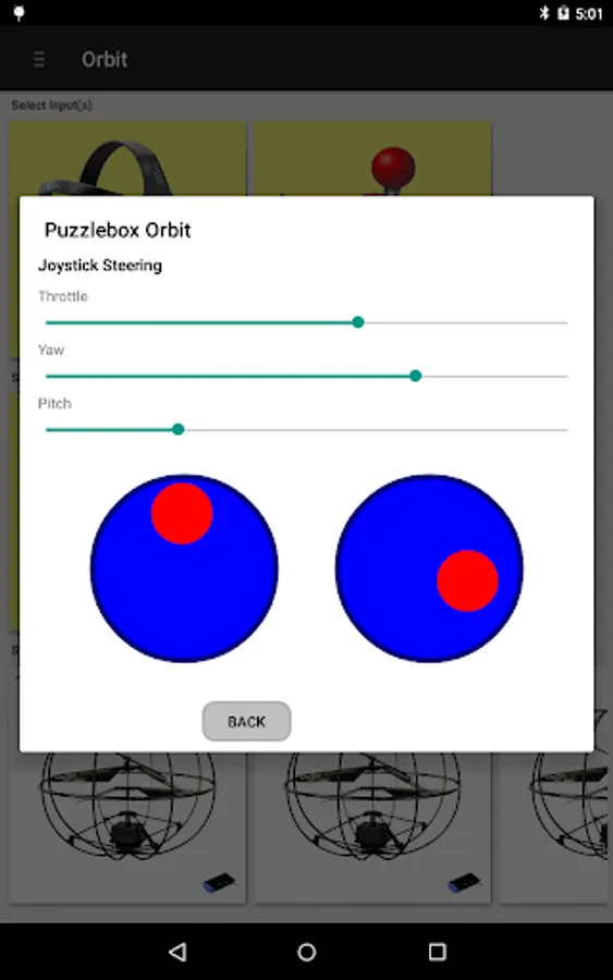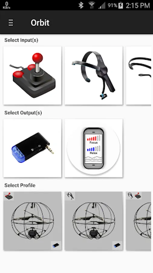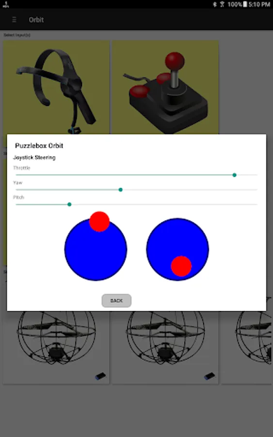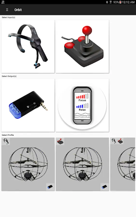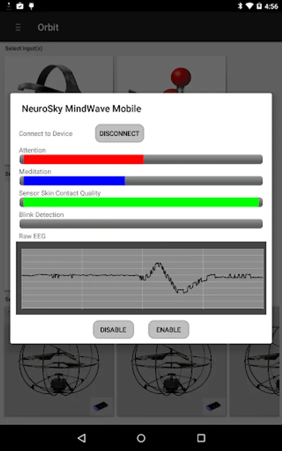 This application connects to a NeuroSky MindWave or Emotiv Insight EEG headset to read your brainwaves. For NeuroSky devices, target levels of focused concentration ("Attention") and/or mental relaxation ("Meditation") are set using sliders. For Emotiv devices "Mental Commands" can be trained to match your specific brainwaves. When you reach your target the Puzzlebox Orbit helicopter will take off. It will continue flying for as long as you maintain your goal. A touchscreen joystick can be used to steer. And session data is now collected, graphed, and can be shared to cloud storage, messaging services, and via email.