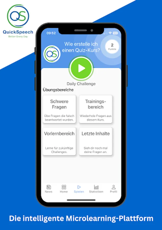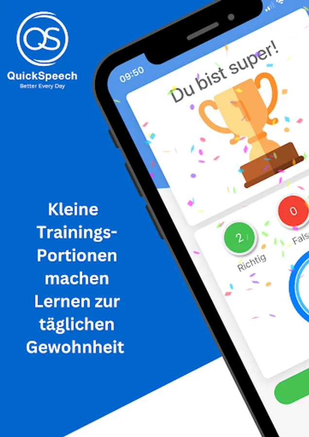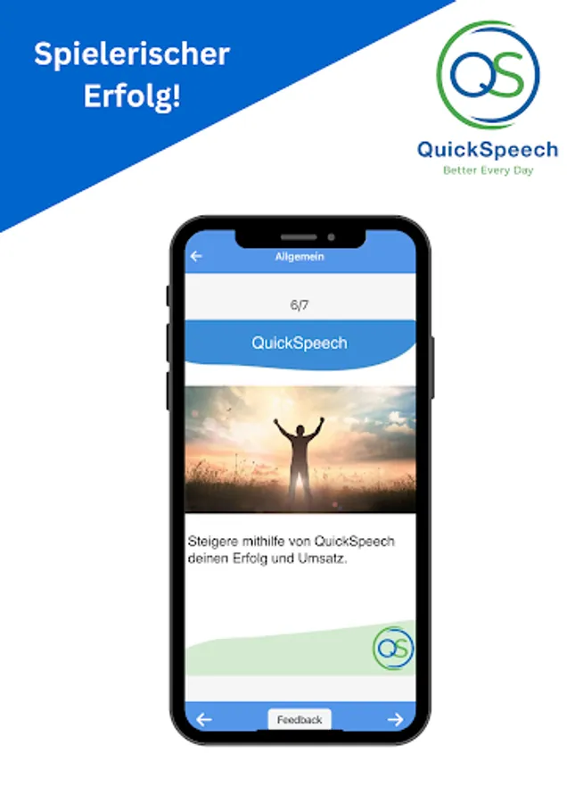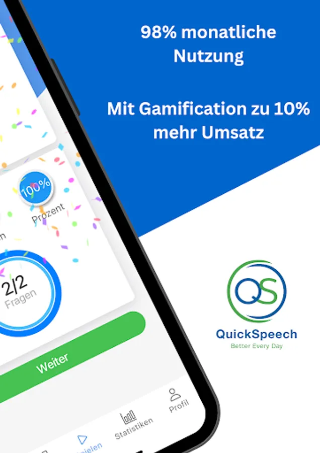 QuickSpeech is the mobile learning app that automatically motivates you to learn every day. The app trains in short portions of knowledge and activates use in a playful way. Employees play in groups, score points and can get great rewards.