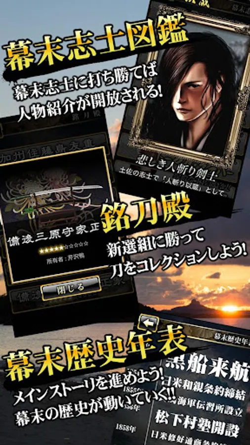 幕末の歴史がよくわかる「幕末歴史年表」は、一定の条件で解放!幕末の歴史を追えるので、よりメインモードを楽しむことができます。