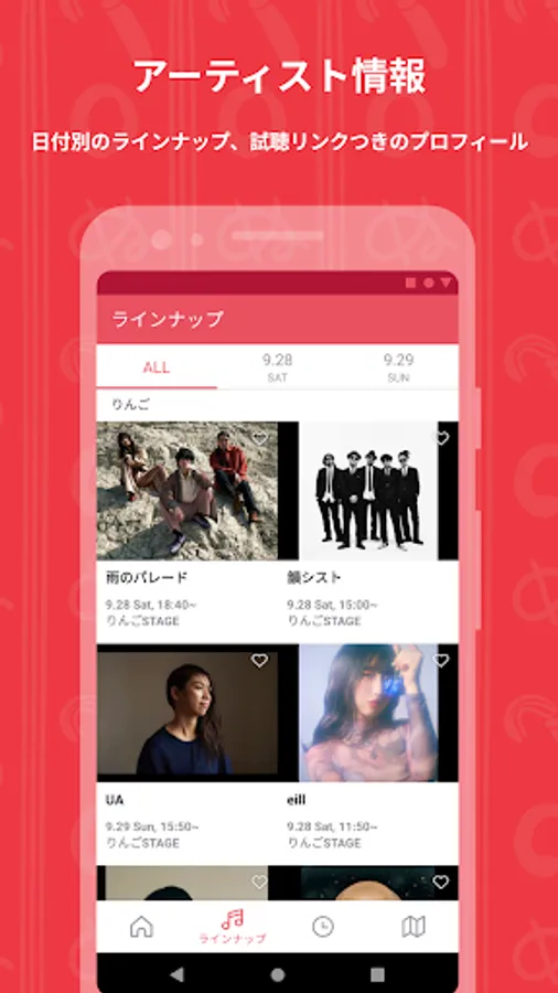 出演アーティストのラインナップを出演日別に確認できます。アーティストの詳細からはMVやApple Music、Spotifyなど各種ストリーミングサービスのリンクで楽曲のチェックができます。