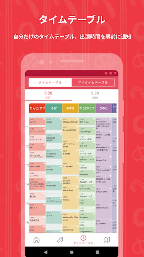出演日別にタイムテーブルを確認できます。マイタイムテーブルの作成や、出演時間が近づくと通知をしてくれる"リマインダー機能"も。マイタイムテーブルはSNSなどでシェアすることも可能です。