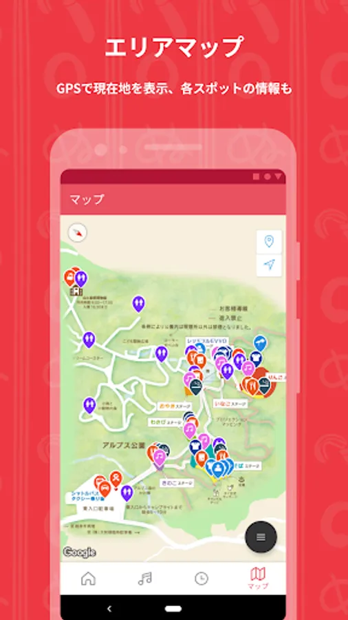 位置情報に対応した会場マップ。ステージやトイレ、各ブースの位置と現在地からの距離を瞬時に確認できます。飲食店の情報もここからチェックできます。