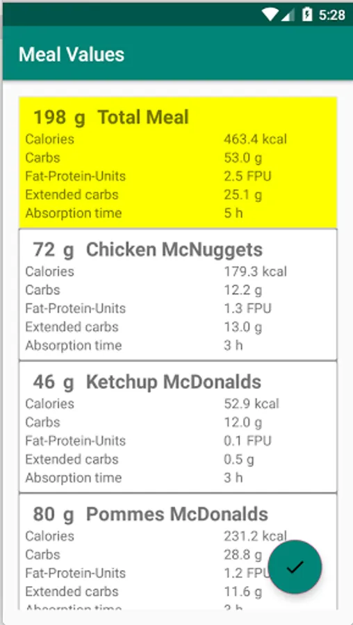 Although carbs are as well calculated, this can be done by many apps today. However, meals with a high portion of fat or protein lead to a late increase in blood glucose. Modern pump therapies can counter this by a delayed bolus. The calculation of the amount of FPUs and the corresponding absorption time is not trivial - and this is exactly what this app is doing.