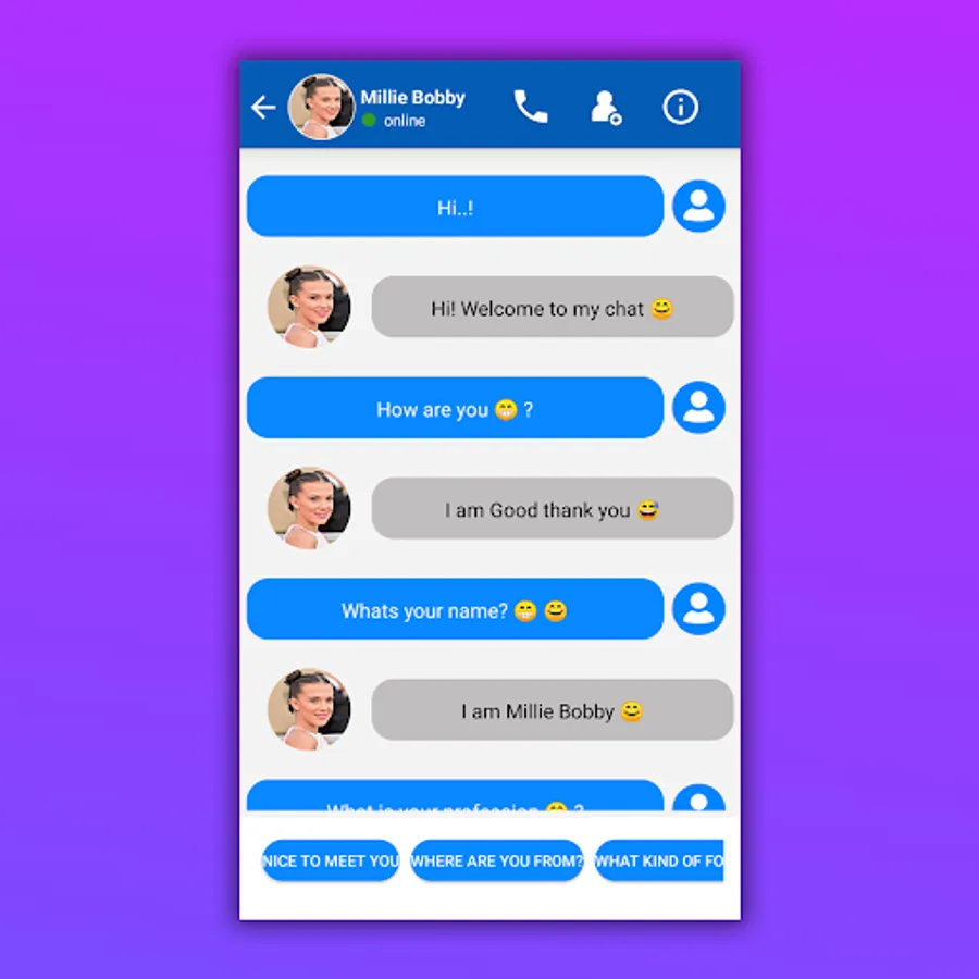 Millie Bobby Brown call video is a simple application is very profissionel application to make call video with your hero Millie Bobby Brown call prank and fake video call and Chat with a simple live chat, Enjoy calling Millie Bobby Brown chat in an easy way, feel free and download this Millie Bobby Brown video call for have fun with friend.