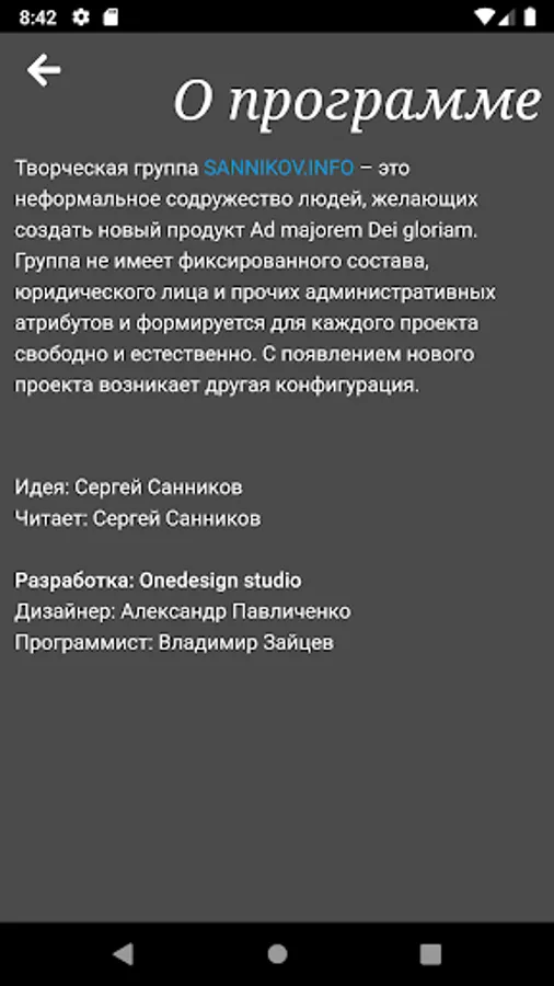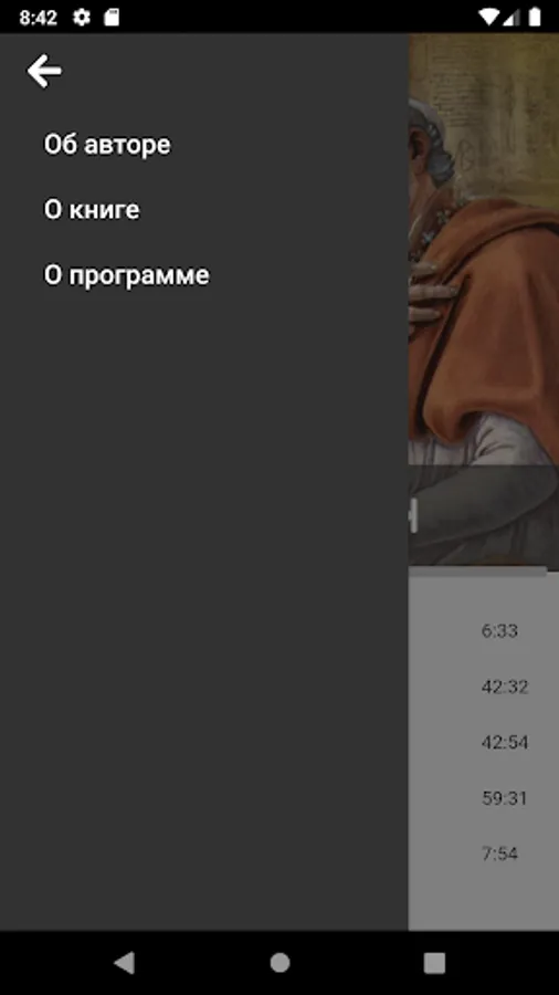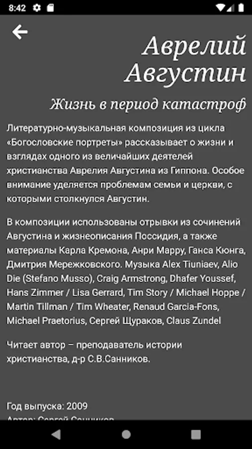 The audiobook uses excerpts from the writings of Augustine and the biography of Possidius, as well as materials from Karl Cremon, Henri Marru, Hans Kung, Dmitry Merezhkovsky. Music by Alex Tiuniaev, Alio Die (Stefano Musso), Craig Armstrong, Dhafer Youssef, Hans Zimmer / Lisa Gerrard, Tim Story / Michael Hoppe / Martin Tillman / Tim Wheater, Renaud Garcia-Fons, Michael Praetorius, Sergey Schurakov, Claus Zundel