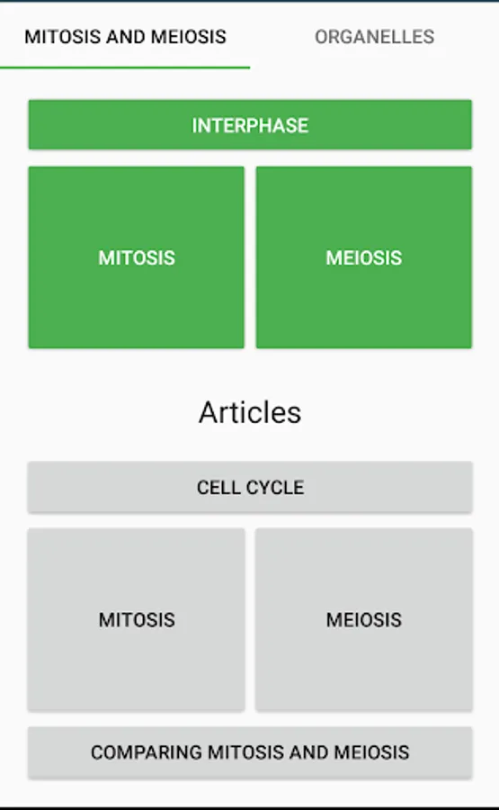 Four articles: cell cycle, mitosis, meiosis, comparison of mitosis and meiosis.