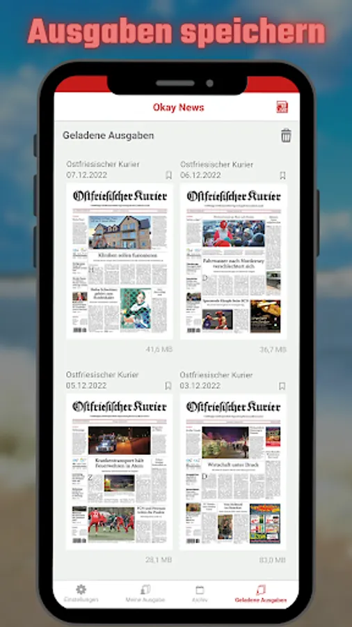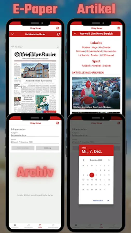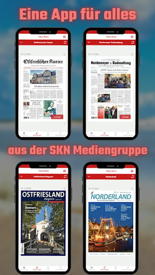 With the live transmission of our daily newspapers "Ostfriesischer Kurier" and "Norderneyer Badezeitung" you will quickly receive a brief overview of what is happening in your (chosen) home country during the day. Don't just switch between these two products, you can also use our other service products! With the help of the app, you also have the opportunity to find out something new from the "Ostfriesland Magazin" every month. Or find out about the latest events in "Norderland", which guides you through the tourism and event events in our region on a daily basis. No tedious leafing through and planning in the morning, just conveniently use the "Okay News" app to choose online which event could enrich the day.