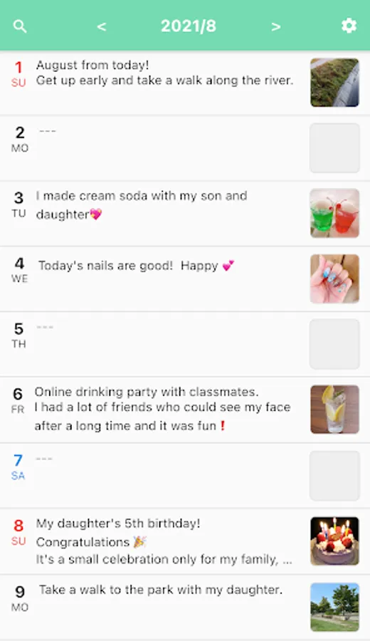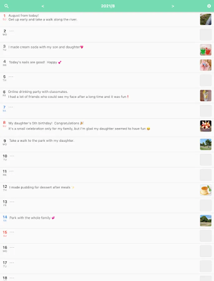 The diary is managed by a vertical calendar. It works well with vertical smartphones.