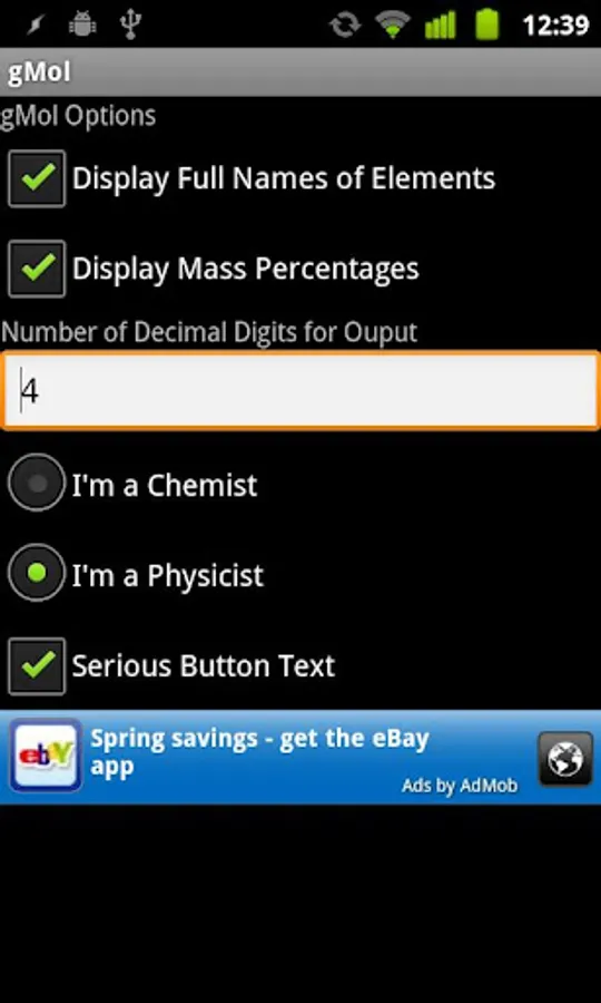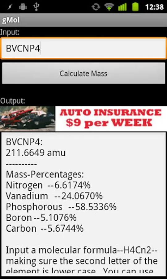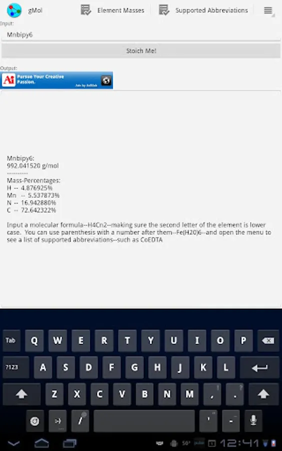 Great alternative to a periodic table and a pencil. gMol will Calculate molar mass (Atomic mass) and elemental mass percentages from a typed chemical formula. Handy for stoichiometry in High School, AP, College or University Chemistry, Biology or (maybe even) Physics classes or research. I hope you find it useful!