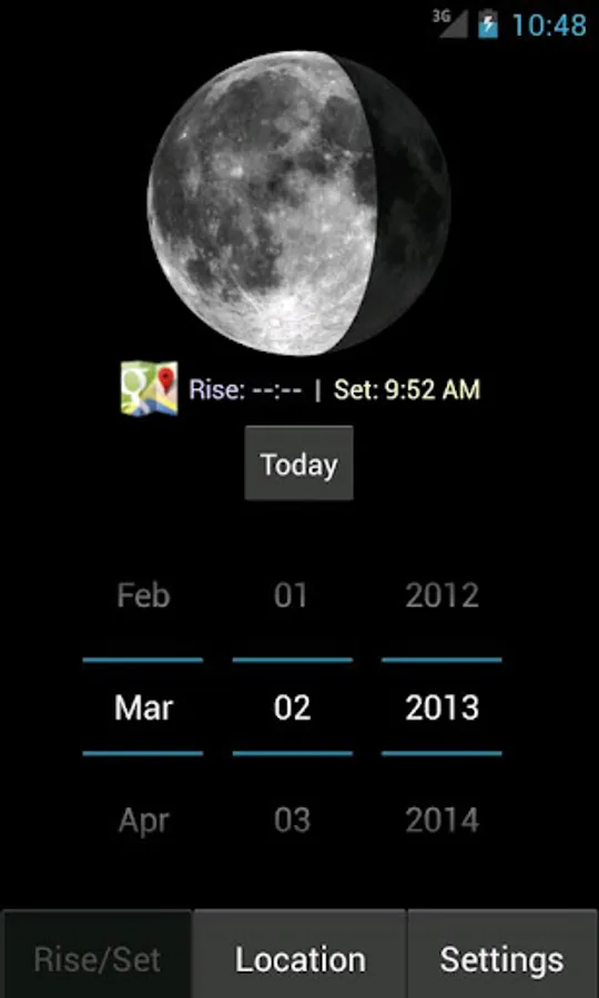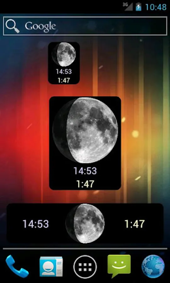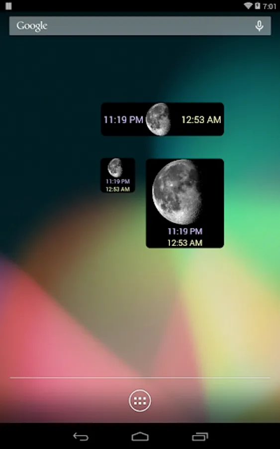 See today’s moon phase and rise and set times right on your home screen. Three sizes of widgets to choose from 1x1, 2x2, and 4x1. Uses the style of moon you pick as well.