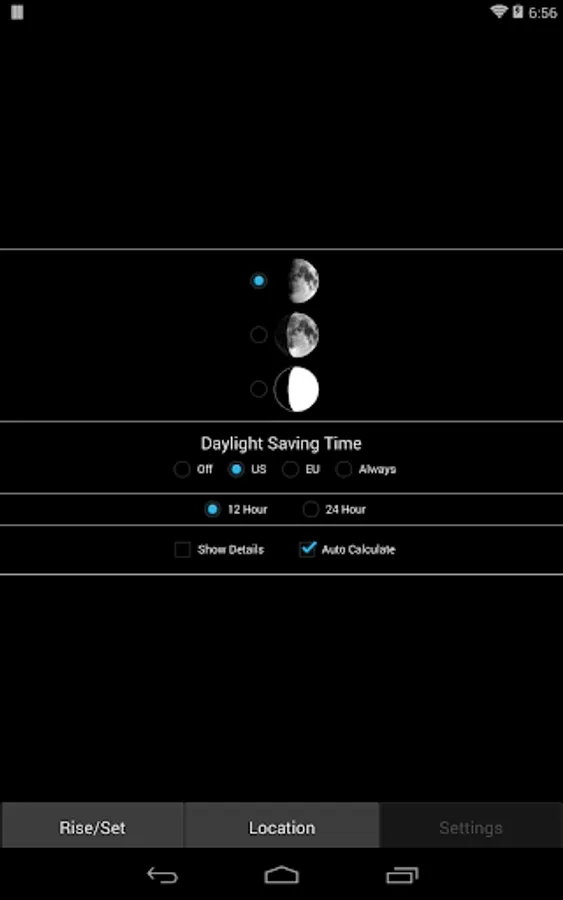 Choose to see more or less details. Turn on or off the illuminated fraction and days until the next full moon. Pick your daylight savings time settings, either US, EU, off, or always on.