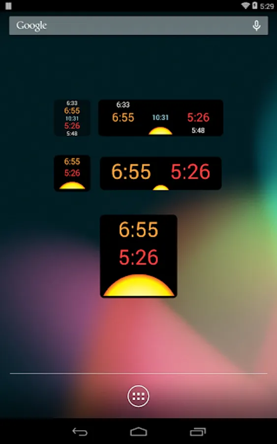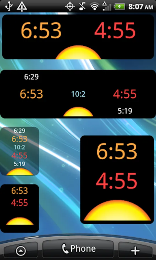 See today’s rise and set times right on your home screen or lock screen. Five styles of home screen widgets to choose from 1x1, 2x2, 4x1, 1x1+, 4x1+.