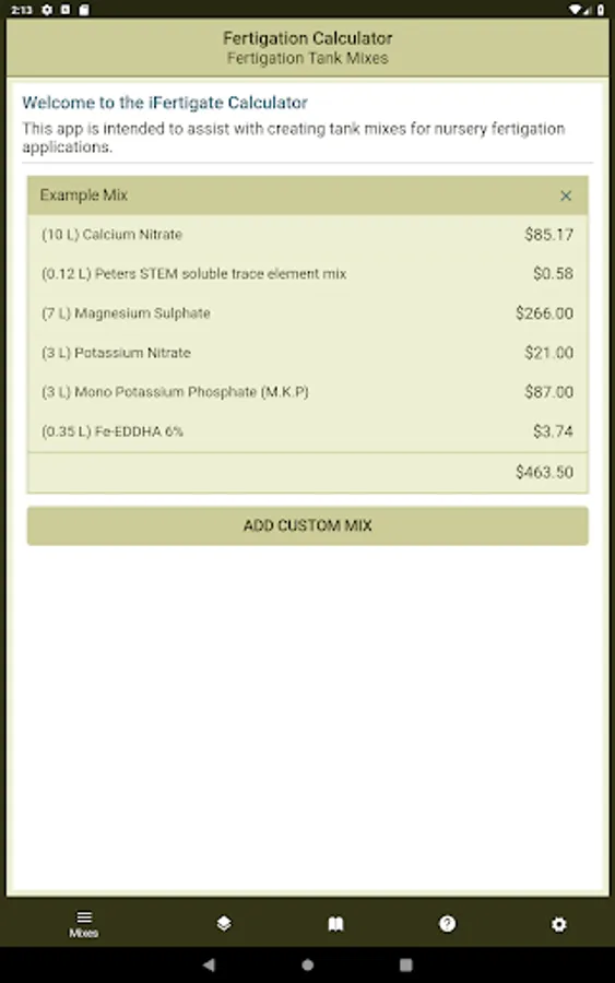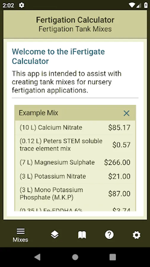 This app is intended to assist with creating tank mixes for nursery fertigation applications.