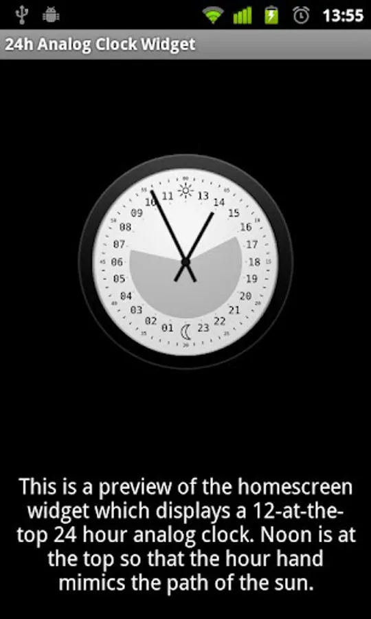 This is a homescreen widget that displays a 12-at-the-top 24 hour analog clock. Noon is at the top, so that the hour hand mimics the path of the sun.