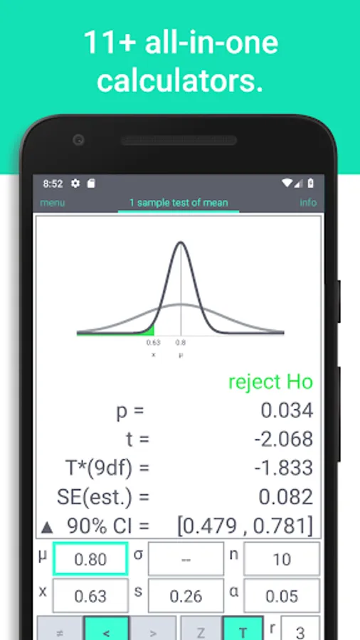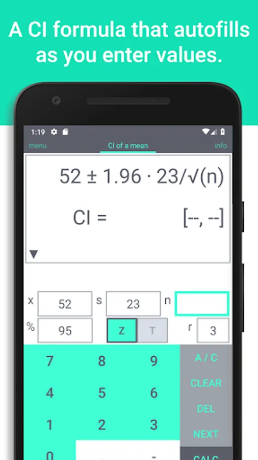 • Press and hold definitions. Every input field has an on-the-spot definition, so you can quickly remind yourself what each statistical symbol means, and enter the correct value for it.