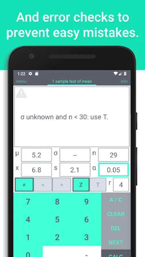 • Error checking. Statmagic automatically checks for typos and anomalous numbers, to help you prevent mistakes. (For example, if you select a Z test when n is < 30 and the standard deviation is not known, Statmagic will politely suggest a T test instead!)
