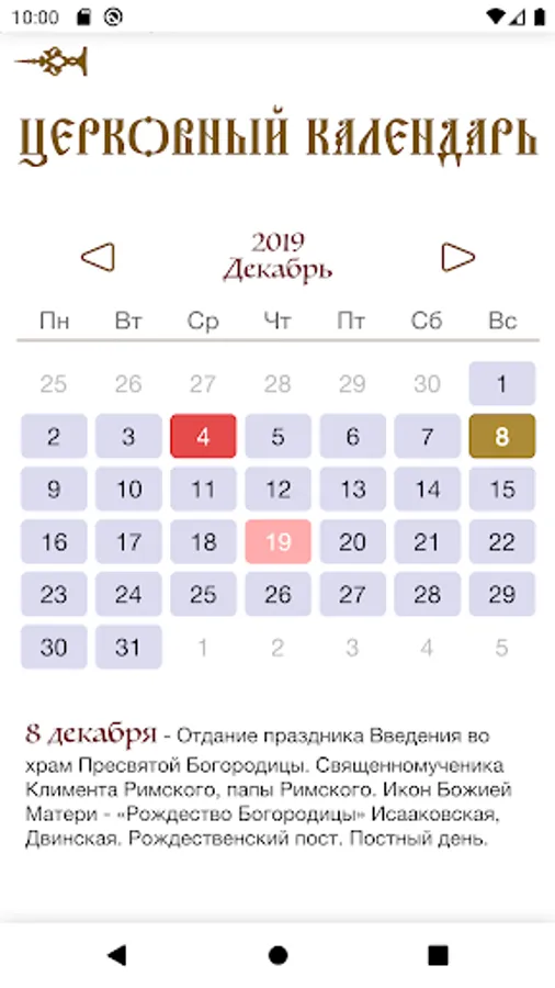 The church calendar contains the schedule of holidays and fasting for 2019 and 2020.