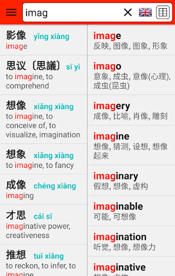 • The most Powerful search: look up words by English, Chinese characters, Pinyin (Number and Tone Mark), or a combination, support for wildcards and full-text search both Chinese and English and also able to show results in duo-list at once.