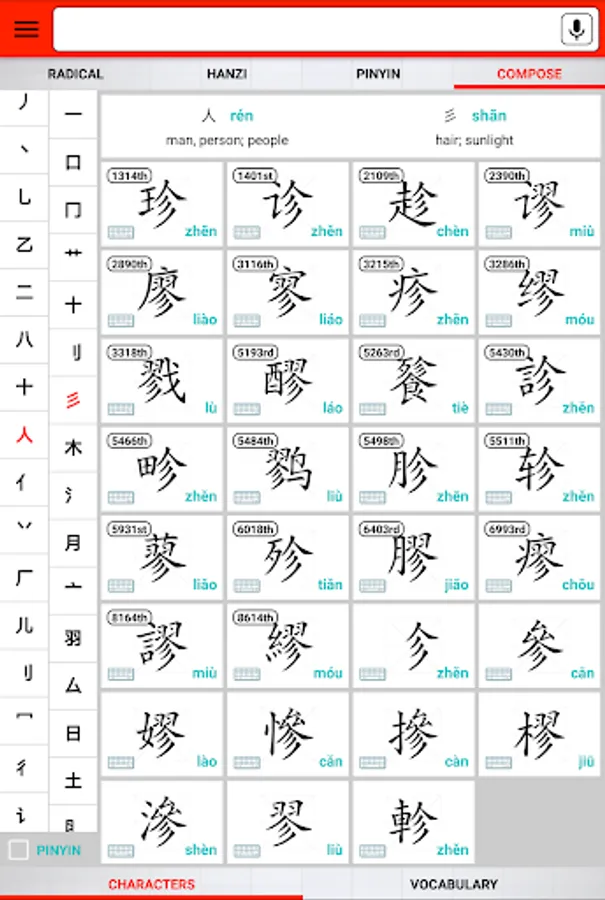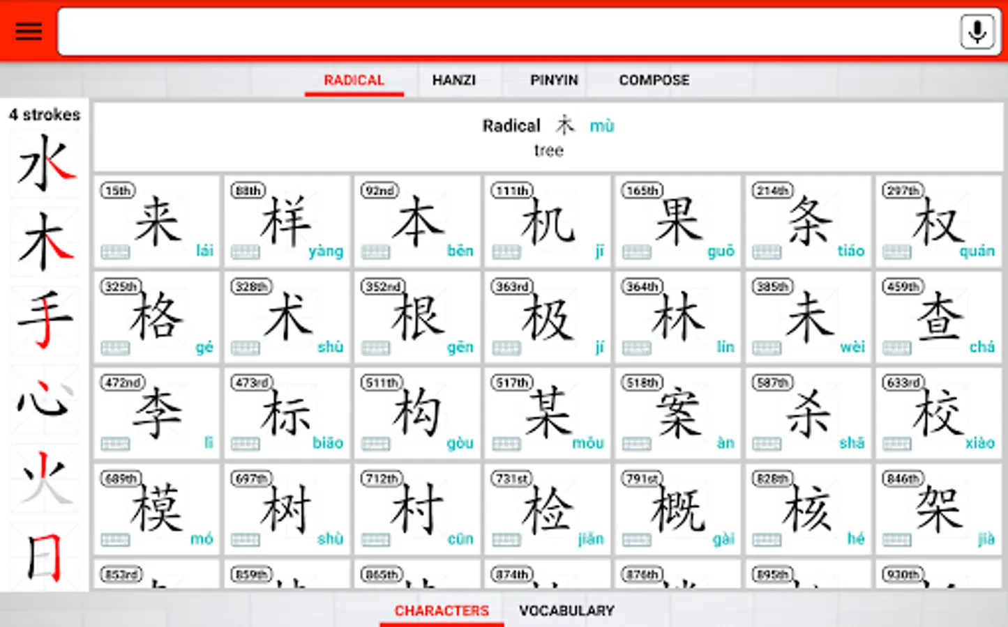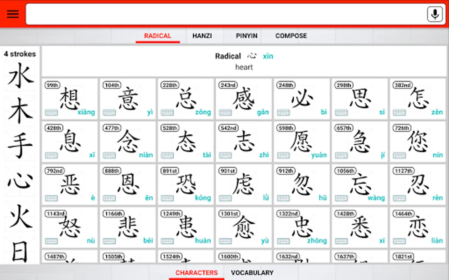 • Radicals and Decomposition: Support Radical search and illustrate how each character compose by semantic or phonetic components.