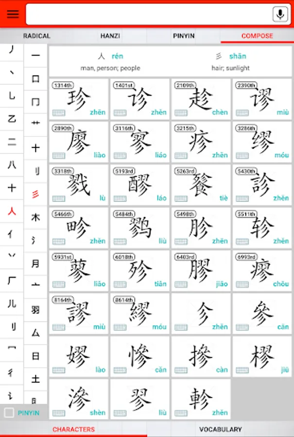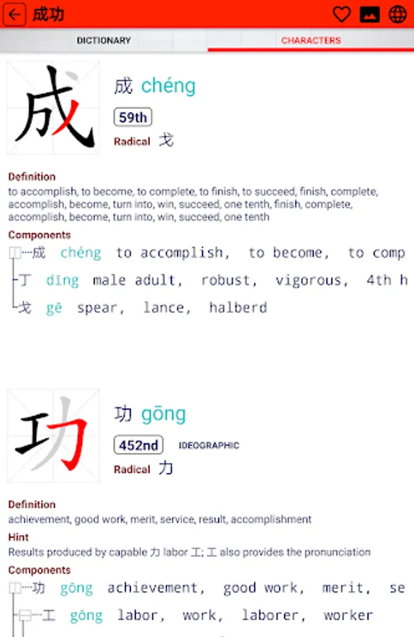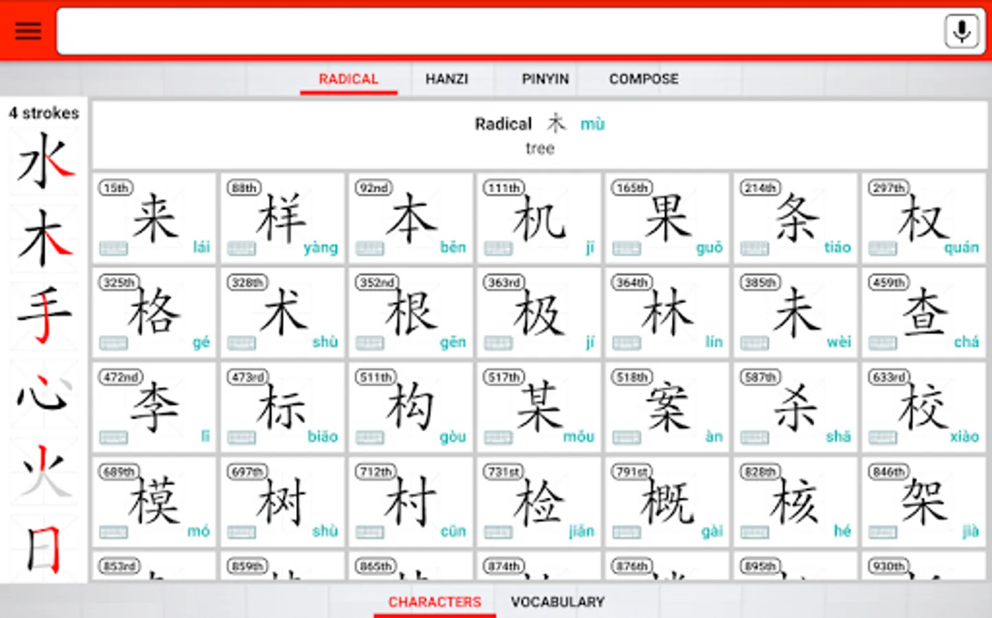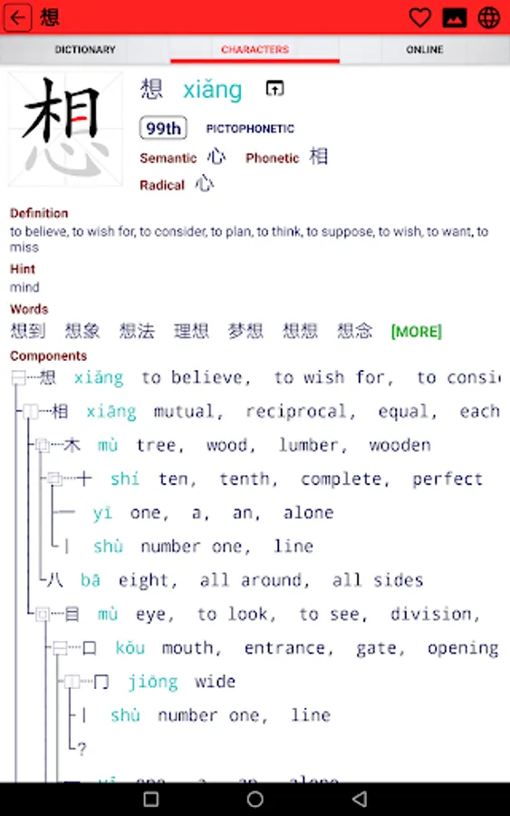 • Radicals and Decomposition: Support Radical search and illustrate how each character compose by semantic or phonetic components.