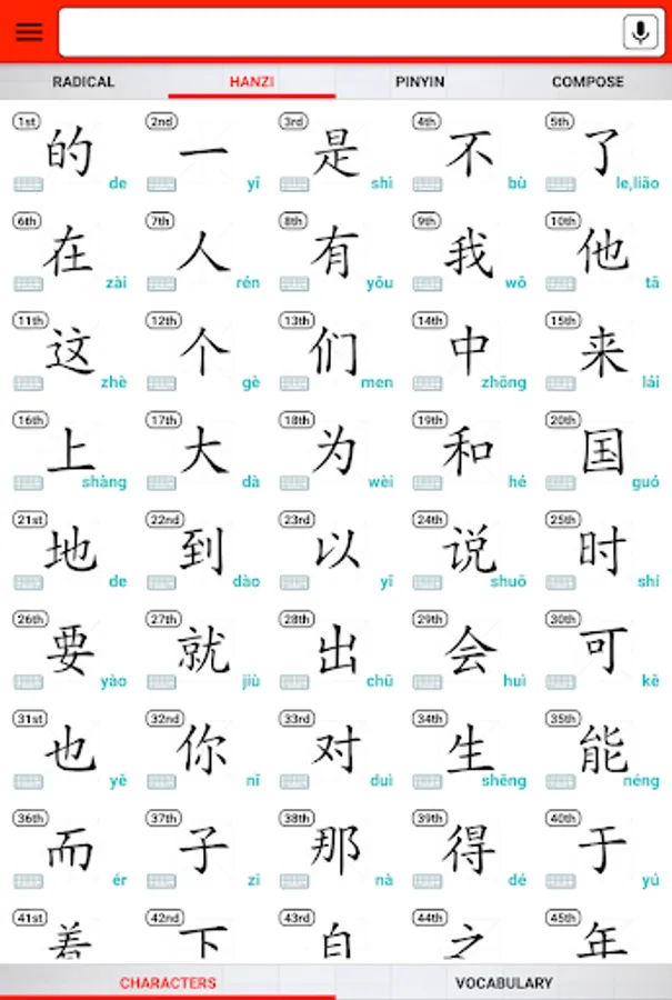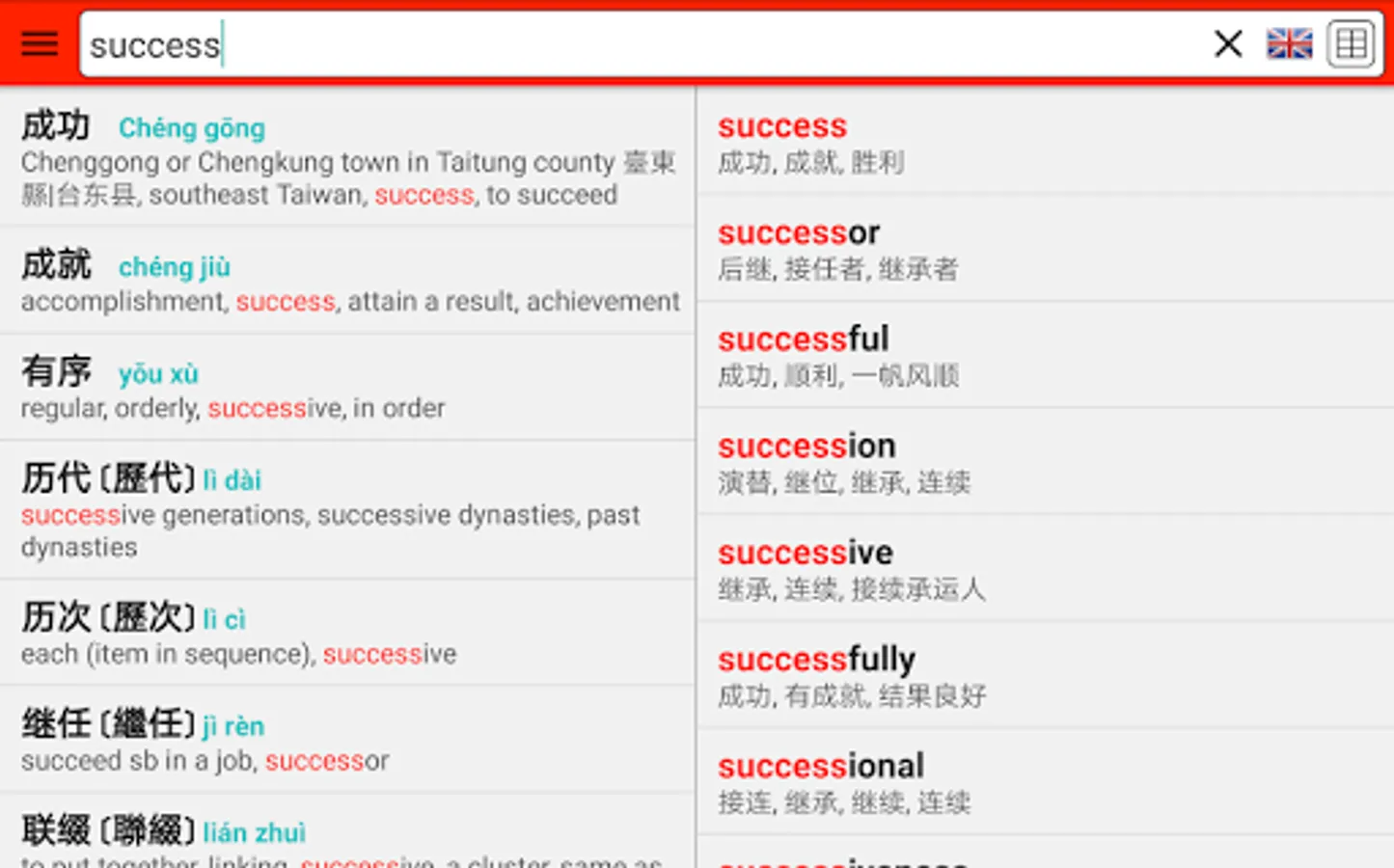 • The most Powerful search: look up words by English, Chinese characters, Pinyin (Number and Tone Mark), or a combination, support for wildcards and full-text search both Chinese and English and also able to show results in duo-list at once.