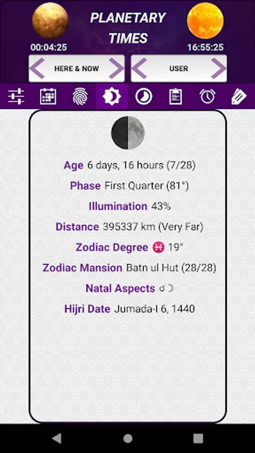 ✴ Moon Tracker (lunar age, moon phase, illumination, distance, and Hijri date)