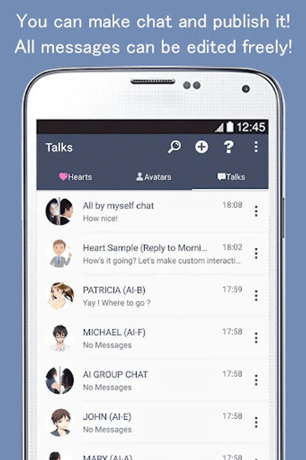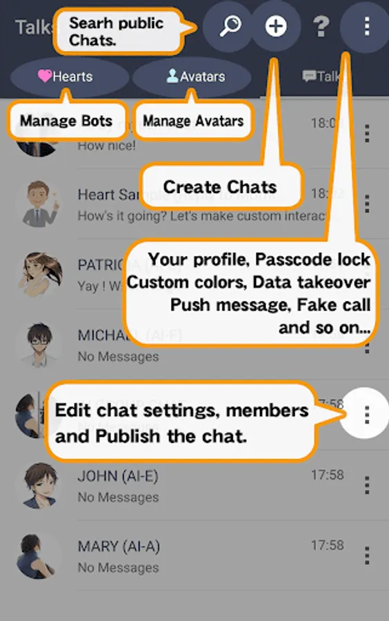 - Chat. You can enjoy conversations with AI and Hearts (Bot), and chatting all yourself.