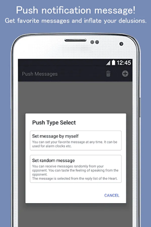 - Push message setting. You can receive a message with Push notification at any time specified from your favorite character.