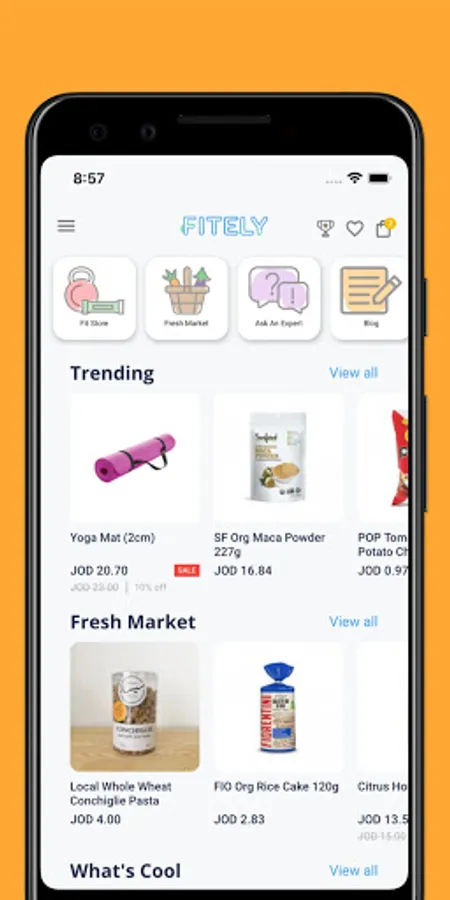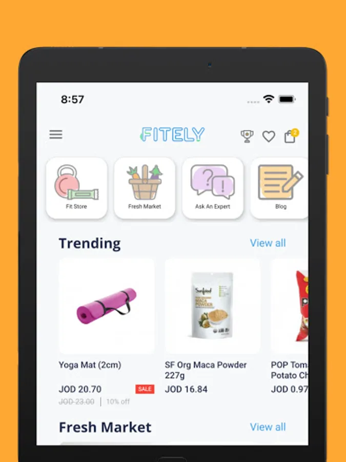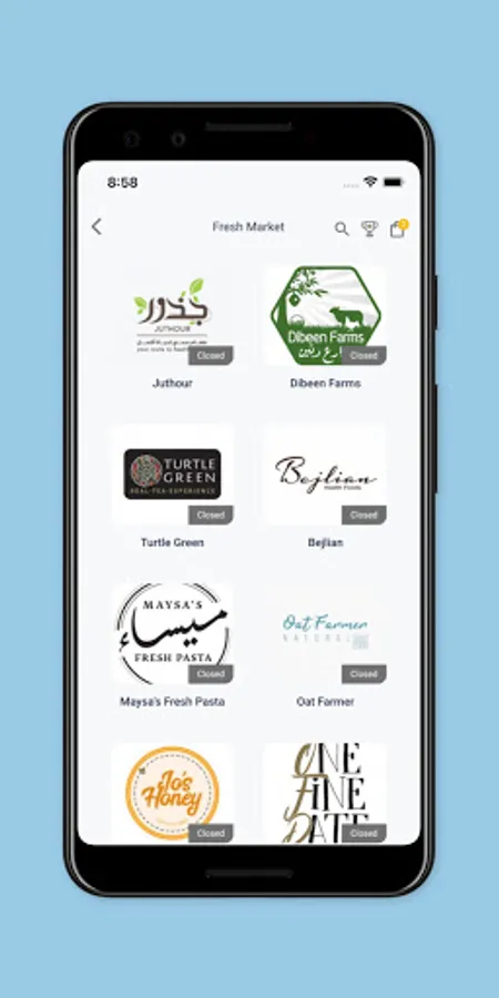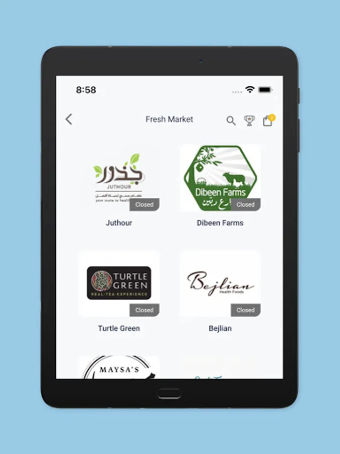 Fresh market, where you can order fresh items from local markets including items such as organic honey, butters, healthy desserts and organic vegetables.