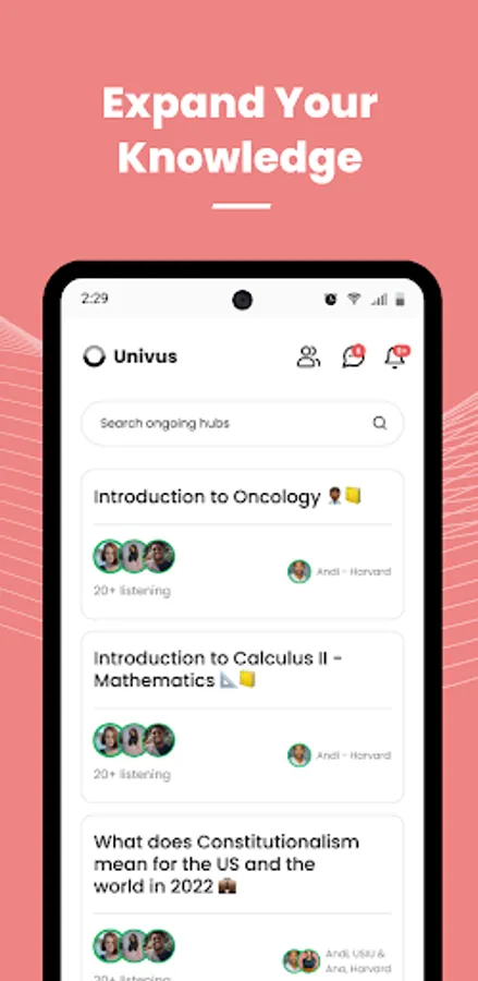 With Univus you can start live topics to discuss with others๐, build a following๐ฅ, and discover new friends in other universities ๐ซ.