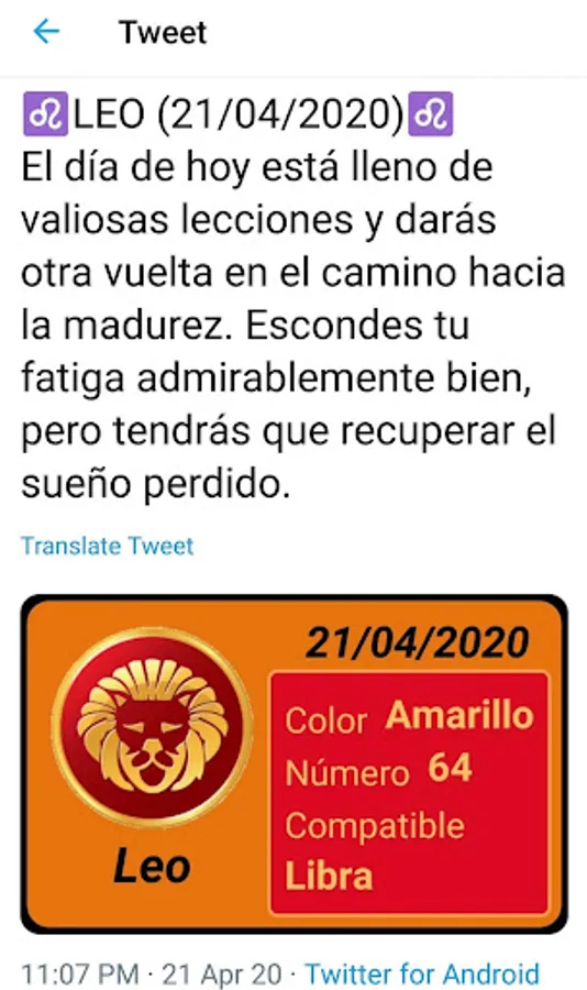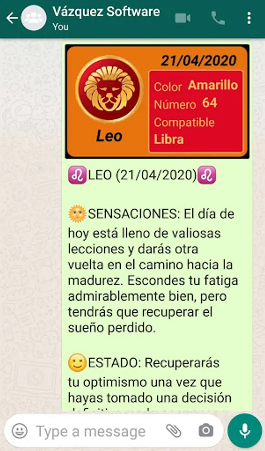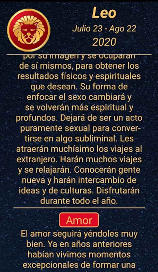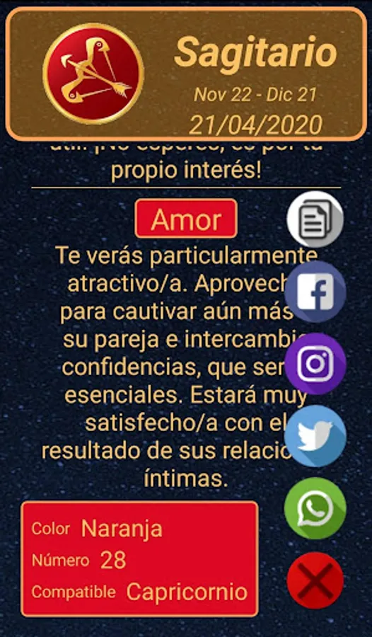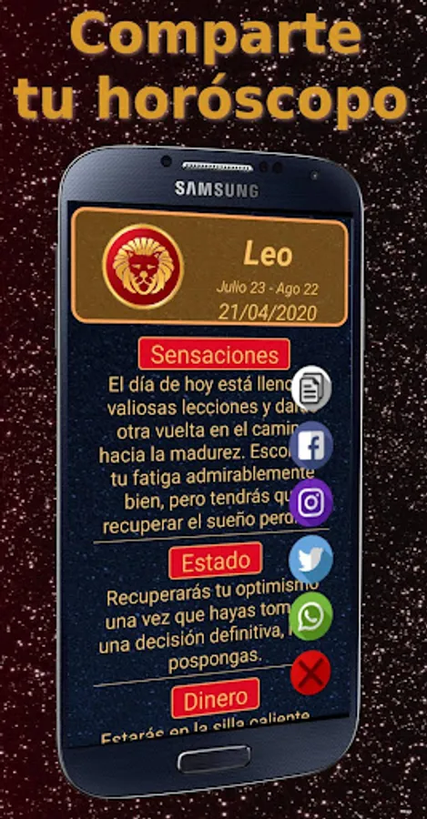 Only in Spanish. Know your horoscope for the whole year and also for each day. It will inform you daily about how you are going to do in love, with your health, with work or money and number and the lucky color for the current day, in addition to the compatible sign of the day. You can also easily share daily horoscopes on WhatsApp, Twitter and other social networks with just one click. It allows you to configure a daily notice to send you a notification so you don't forget to check your horoscope.