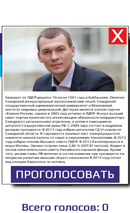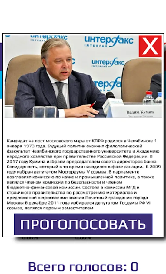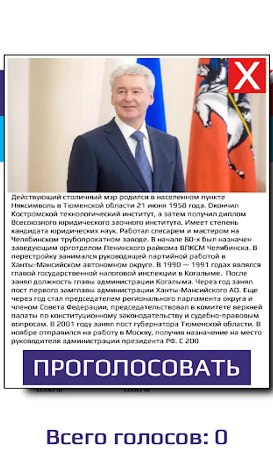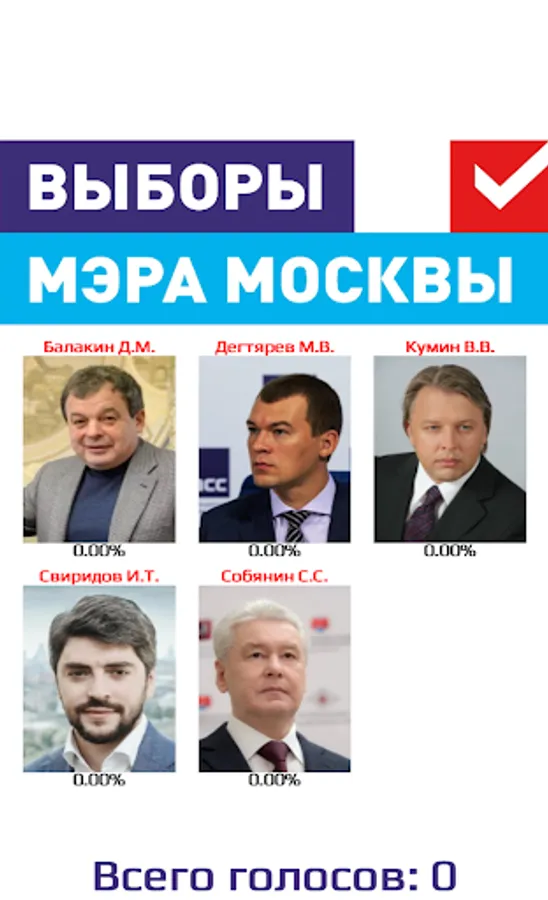 You love your city in Moscow, do you want to make it better? The future of your city is in your hands. City improvement, road situation, health, as well as social benefits depend on the Mayor of the city. And who will be the mayor of Moscow depends on you and your choice. The official election of the mayor of Moscow will take place on September 9, 2018, but right now you can express your opinion and vote for the best candidate in your opinion! Now there is a unique opportunity to find out who can become the mayor of Moscow as a result of fair elections. The app shows real results of voting of real people of Russia, because Moscow is inhabited not only by Muscovites and they also have the right to make their choice. Never before had the city mayor elections been held so honestly, quickly and simply. Just one click and your voice is considered. One device is one voice. Now your voice has real meaning. Online elections of the mayor of Moscow in 2018 - it's convenient, find out in advance who can become the future mayor of Moscow. You are not going to go to the polls - vote here, express your honest opinion.