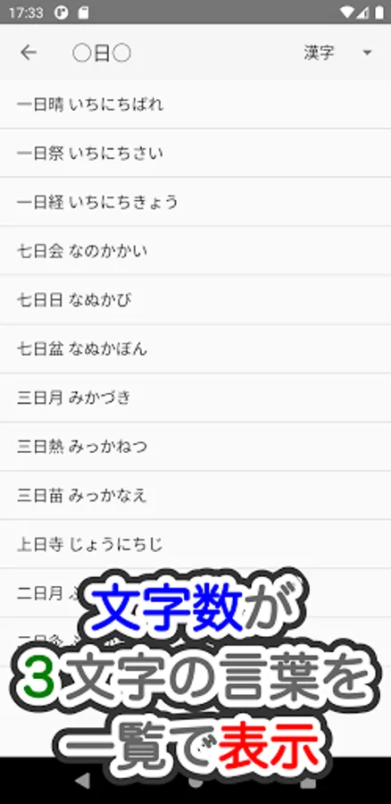 If you search for the word "Ichi" in the first letter and "Ichi" in the third letter, a list such as "Ichigo Ichidai", "Ichigo Ichikai", and "One word one phrase" will be displayed.