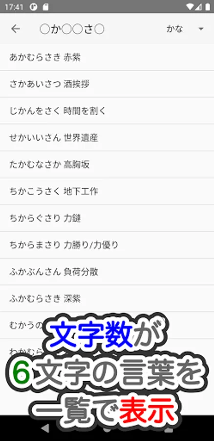 If you search for the word "ka" as the second letter and "sa" as the fifth letter, a list such as "Akamurasaki", "Jikansaku", and "Sekai-san" will be displayed.