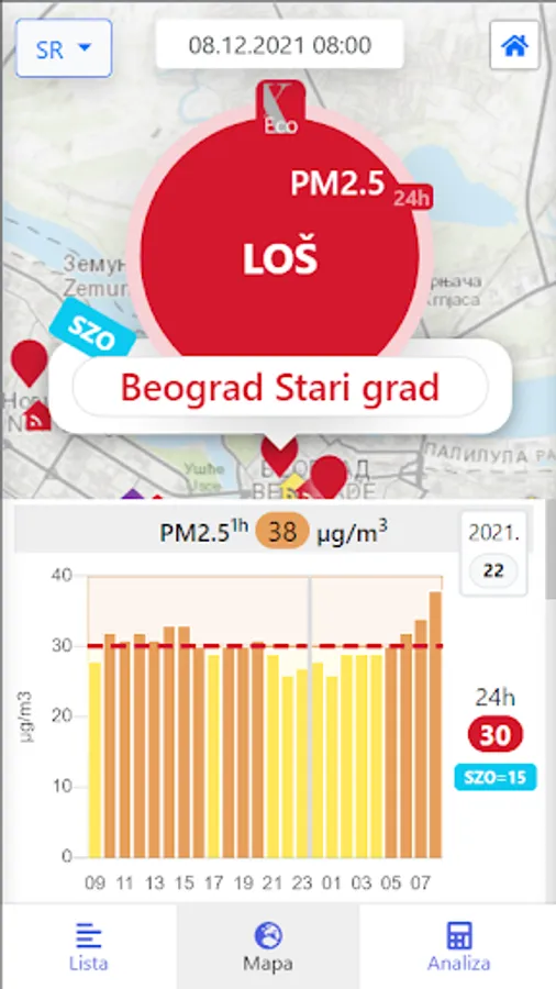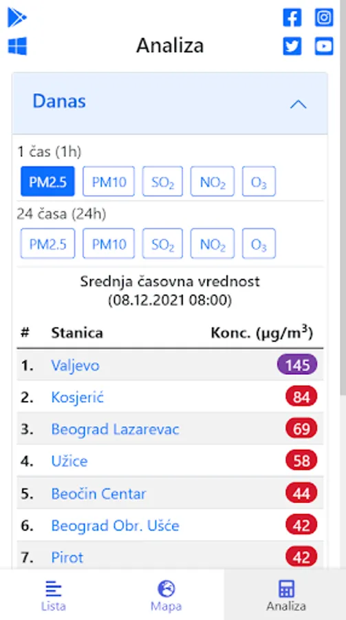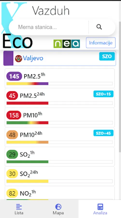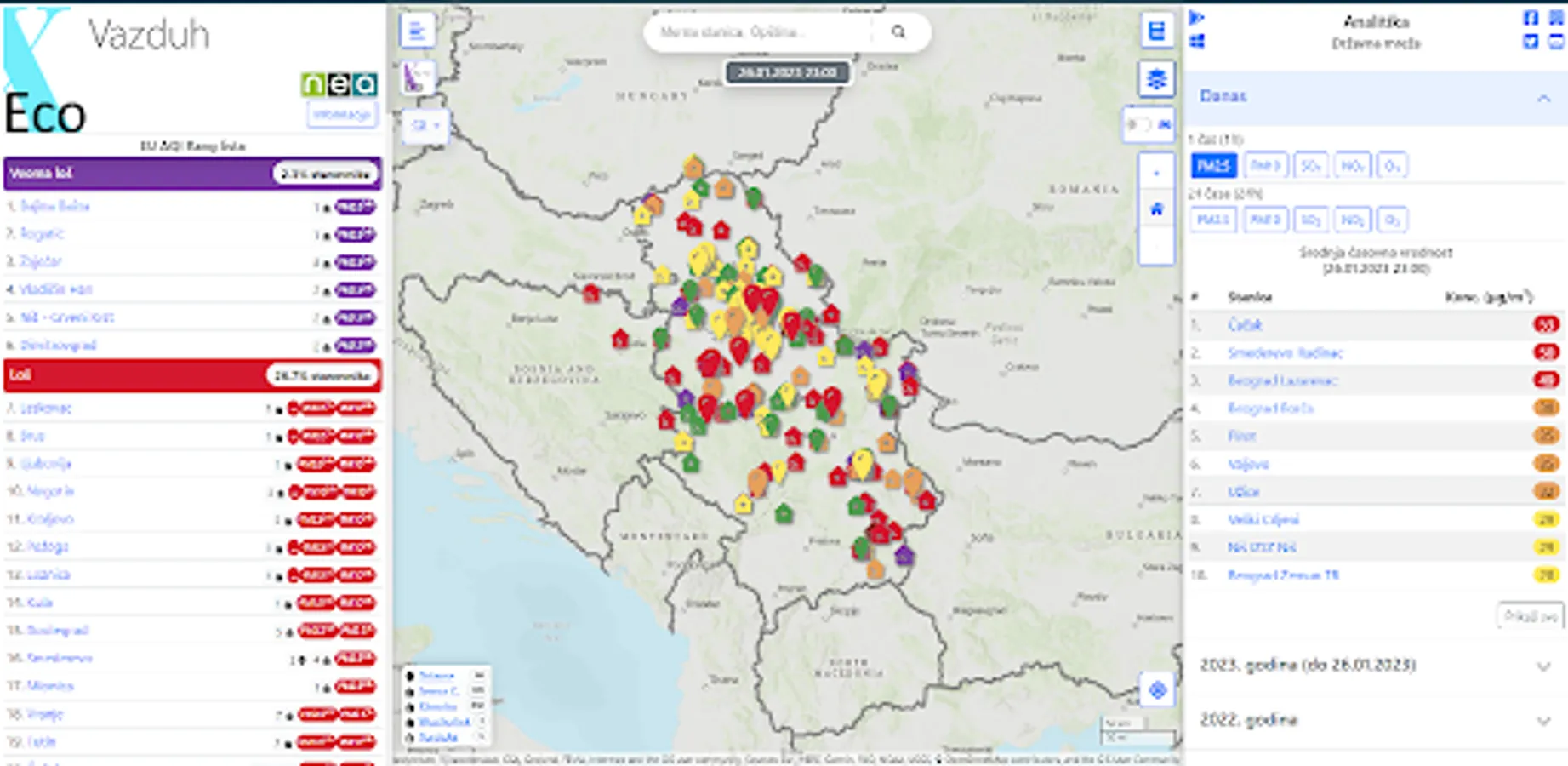 The application xEco Air ("eXtreme ECOlogy" - Extreme Ecology) presents the European Air Quality Index in the Republic of Serbia using data on concentrations of five pollutants: Suspended particles up to 10 and 2.5 microns in diameter (PM10 and PM2.5), sulfur dioxide (SO2), nitrogen dioxide (NO2) and ground-level ozone (O3).