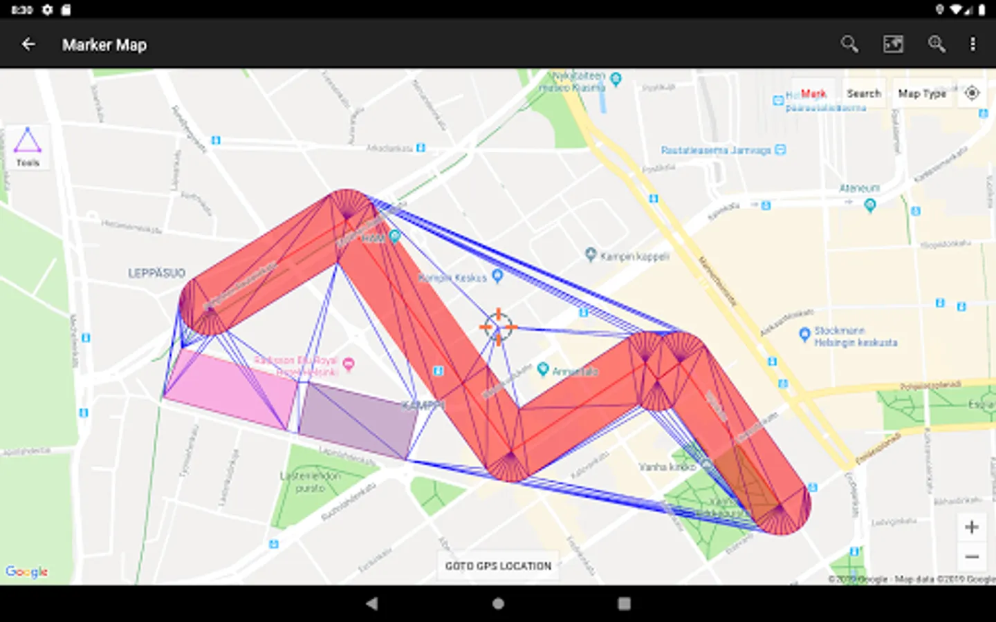 Marker Map: Similar to the Map Coordinates module but with more complete & complex geometry calculation such as displaying Dynamic / Variable Buffers. In this module geometric analysis such as TIN & Voronoi Diagrams can be made from a combination of point data (markers) as well as lines and polygons (breakline). These geometries can also be exported to KML or DXF files for use on other devices or PC.