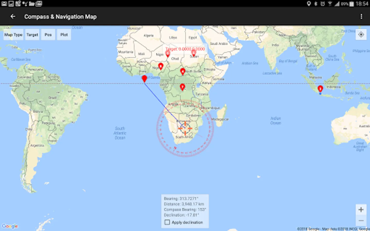 Compass Map: Module with a map and compass with magnetic declination, can be used to assist in navigating or measuring the azimuth angle and determining distance & direction.